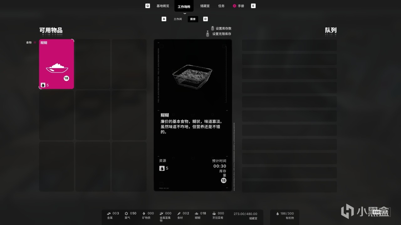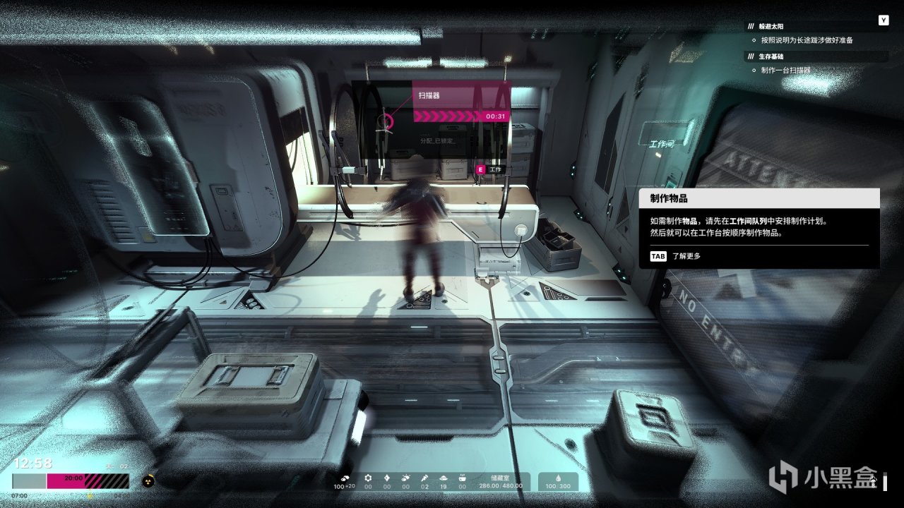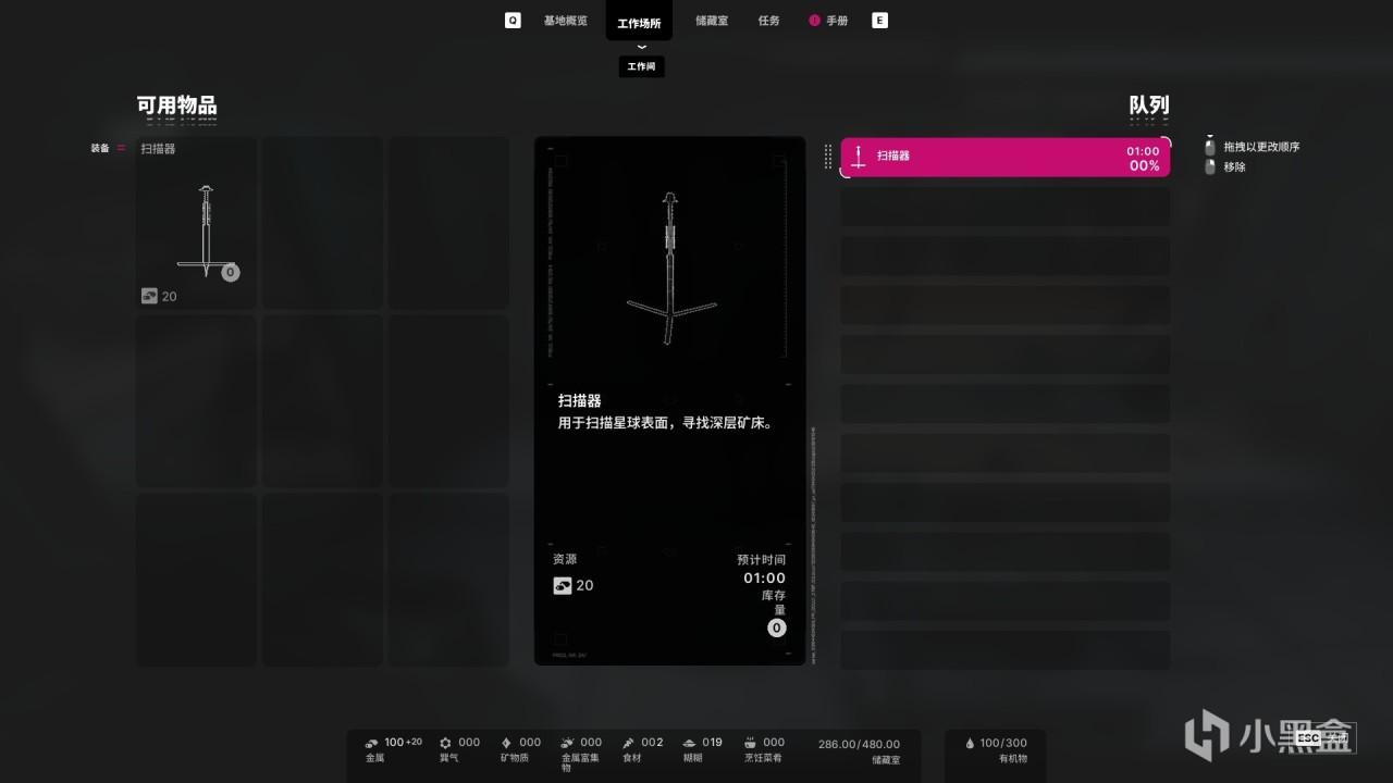 根据任务指引回去建造个工作间,生产一下扫描器,用来找有机物资源,再次夸一下加速打造物品时间流逝!