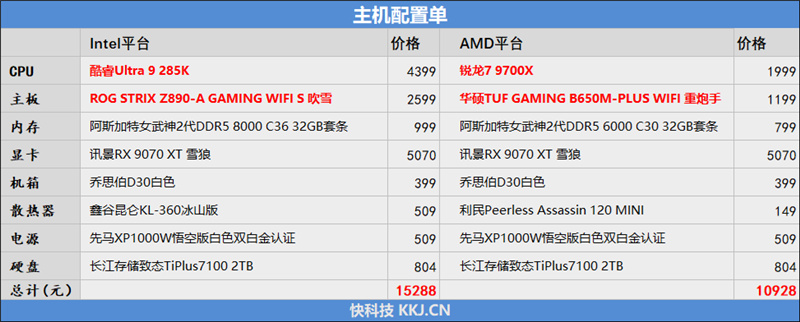 AMD平臺總價10928元,其中顯卡就佔了一半的成本,總體預算比Intel少了4000多元,主要是Intel這邊的處理器、主板和散熱器價格要明顯高一些。