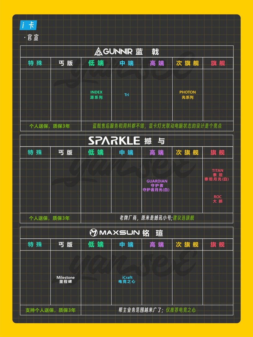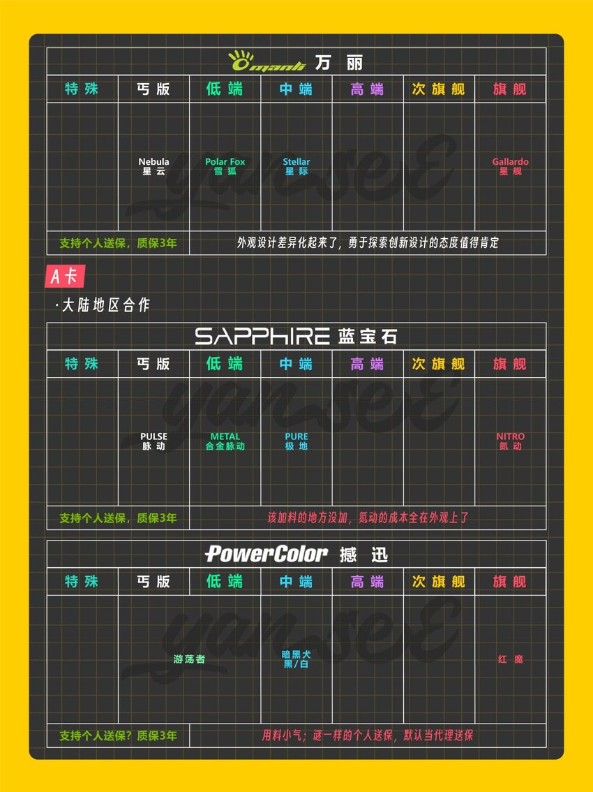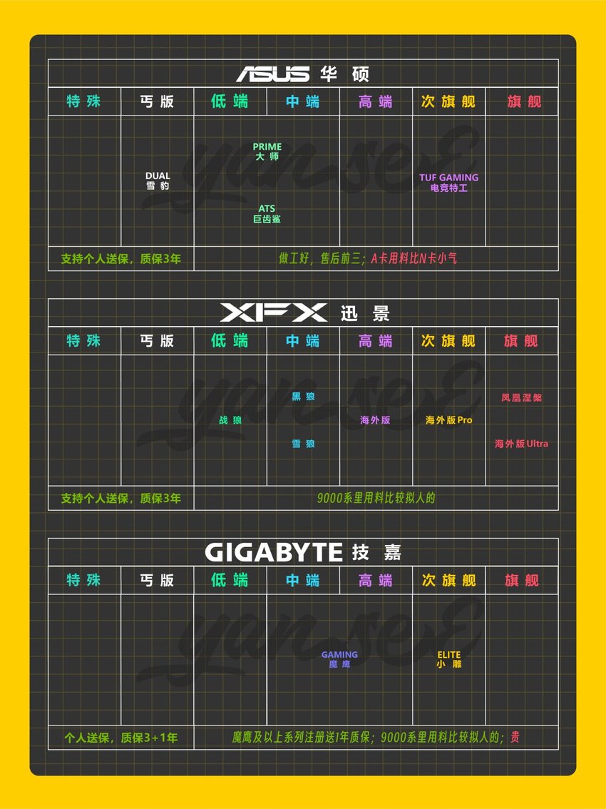 此次主要收錄50系(N卡)、9000系(A卡)、B系列(I卡)等各家新一代顯卡且在國內銷售的非公廠商品牌。帶有個人主觀性,僅供參考。