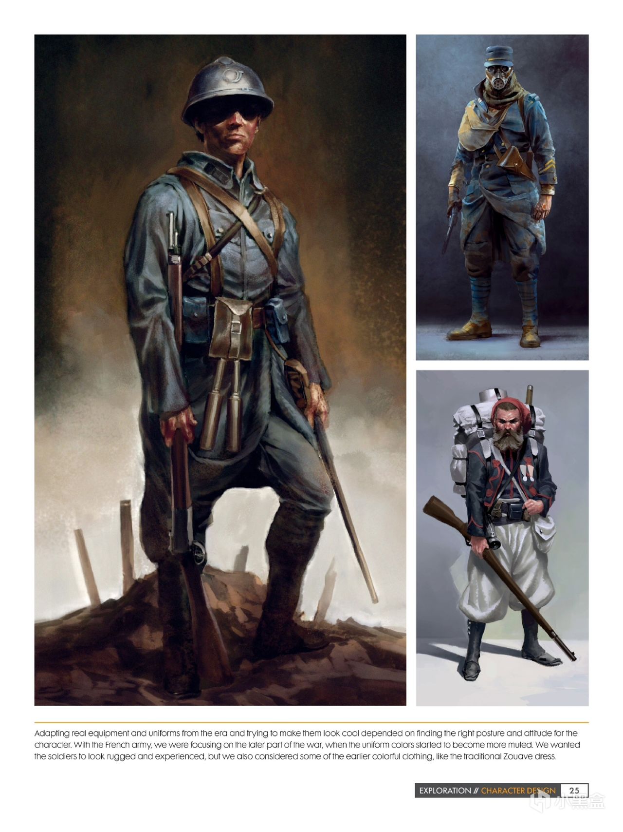 将那一时代的真实装备和军装进行改编并尝试让它们看起来酷炫,关键在于找到角色的正确姿势。对于法国军队,我们专注于战争后期,当时军装颜色开始变得更加沉闷。我们希望士兵看起来粗犷而富有经验,同时也考虑了一些早期的色彩鲜艳的服装,比如传统的Zouave服装。