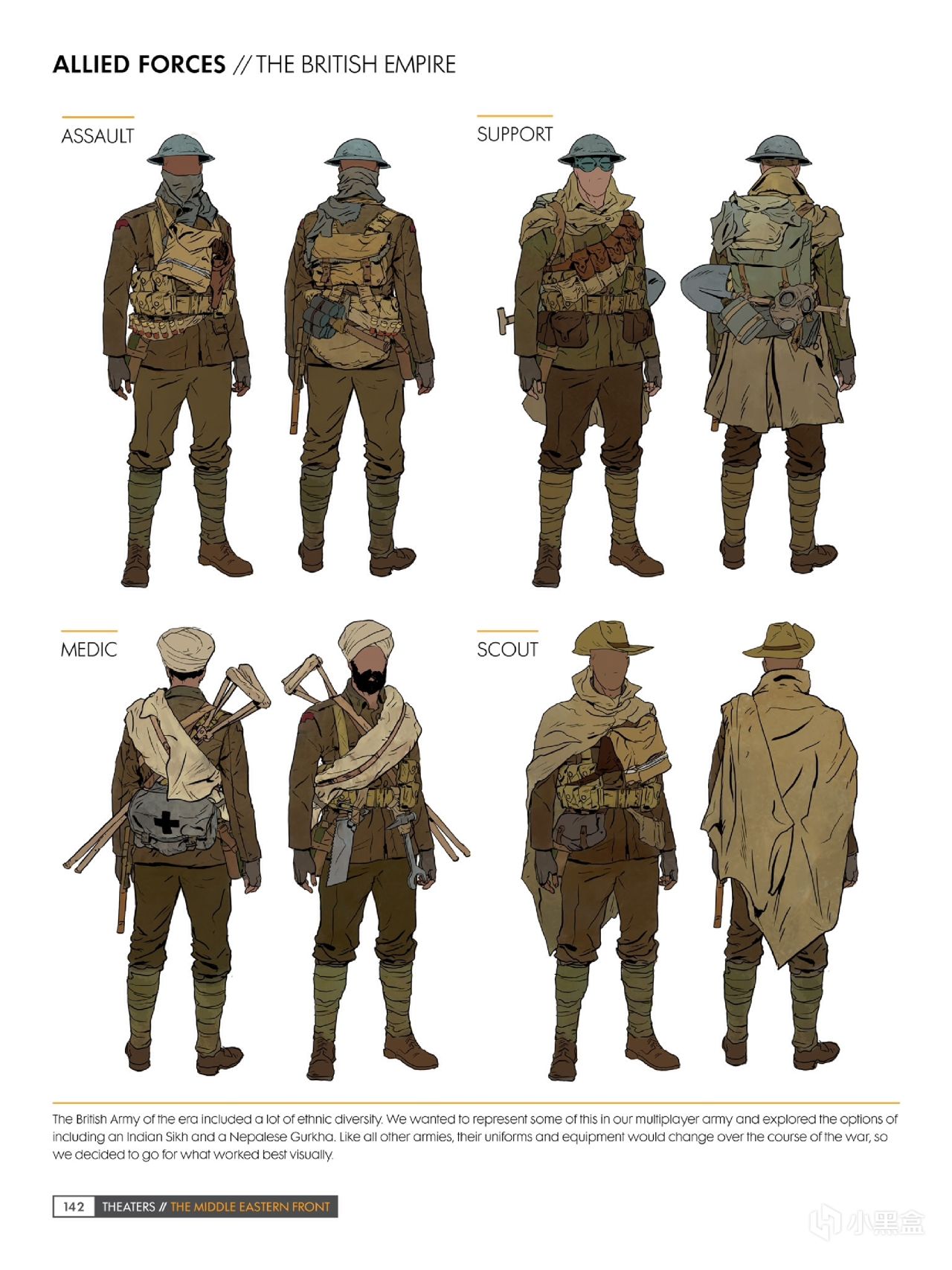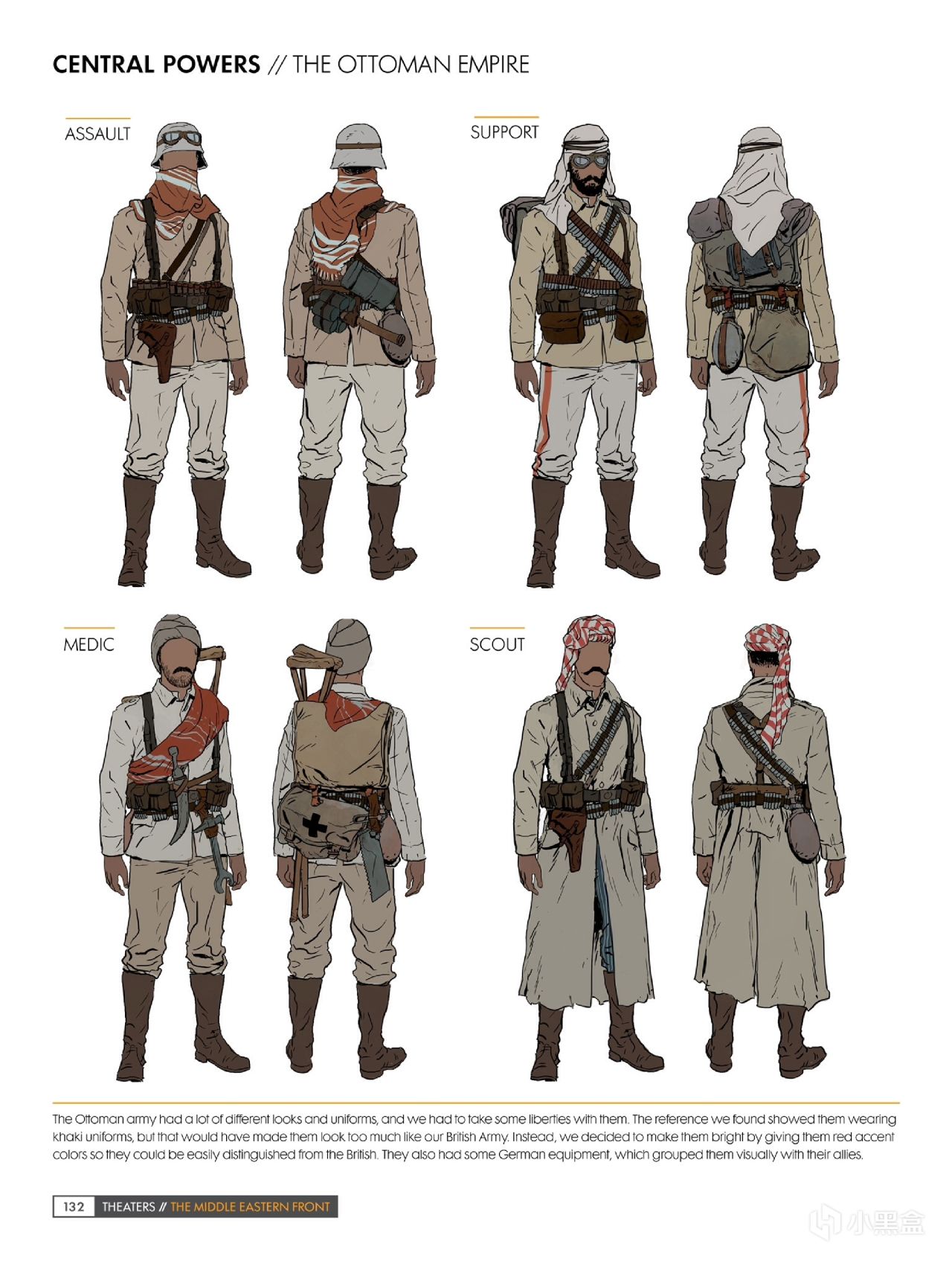 奥斯曼军队拥有多种不同的外观和制服,我们不得不对它们进行一些调整。我们找到的参考资料显示他们穿着卡其色制服,但这会让他们看起来太像英国军队。因此,我们决定通过添加红色点缀色来让它们显得更加醒目,以便与英国军队区分开来。他们还配备了一些德国装备,这在视觉上将他们与盟友区分开来。