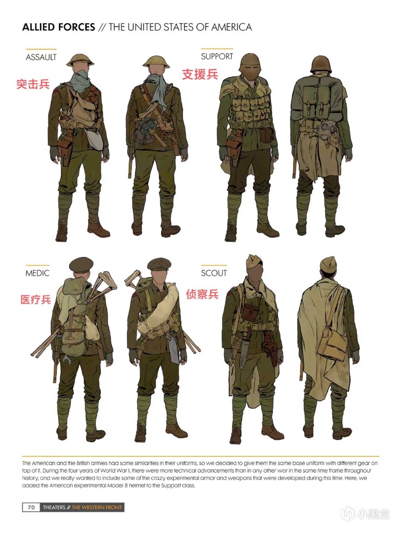 美国和英国军队在制服上有些相似之处,因此我们决定为他们提供相同的基础制服,并在其上搭配不同的装备。在二战的四年间,技术进步的程度超过了历史上所有的战争。 我们特别希望纳入这一时期研发的那些前卫实验性装甲与武器。在此,我们为支援兵种新增了美国实验型头盔。
