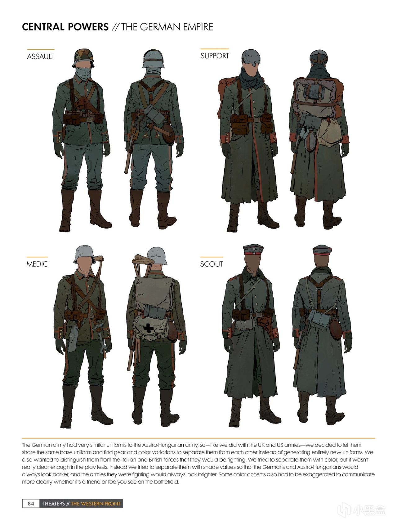 德国军队与奥匈帝国军队的制服非常相似。因此,就像我们对英国和美国军队所做的那样,我们决定让它们使用相同的基础制服,并通过装备和颜色来区分彼此,而不是为它们设计全新的制服。我们还希望将它们的外貌与要对抗的意大利和英国军队区分开来。我们试图通过颜色来区分它们。 但在游戏测试中,这种区分并不够明显。于是我们尝试通过明暗值来区分,使得德国和奥匈帝国军队始终显得较暗,而他们对抗的军队则始终显得较亮。某些颜色细节也需要夸张处理,以便在战场上更清晰地辨别友军还是敌军。