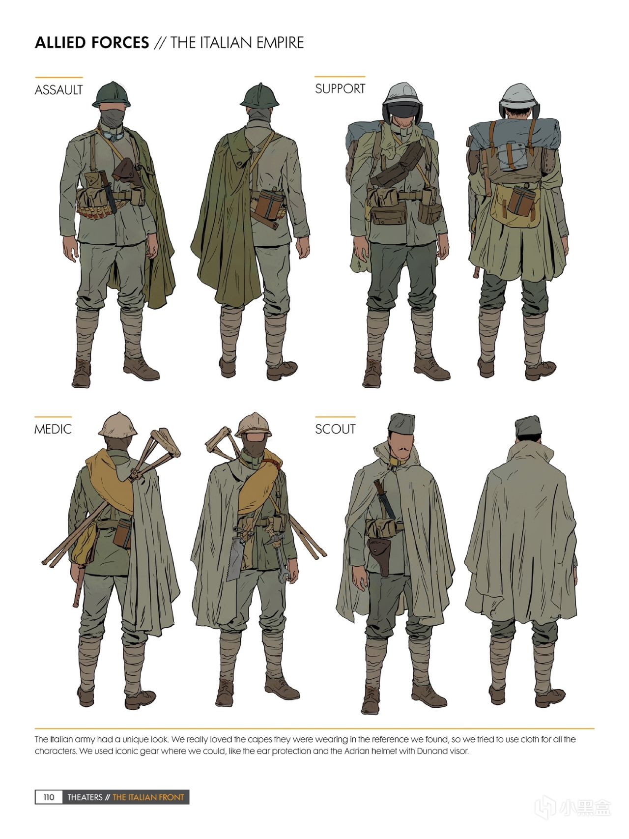 意大利军队有着独特的装扮。我们非常喜欢他们在参考资料中穿的斗篷,所以我们尝试为所有角色都使用斗篷。我们尽可能使用了标志性的装备,比如耳部防护装置和配有杜南护目镜的阿德里安头盔。