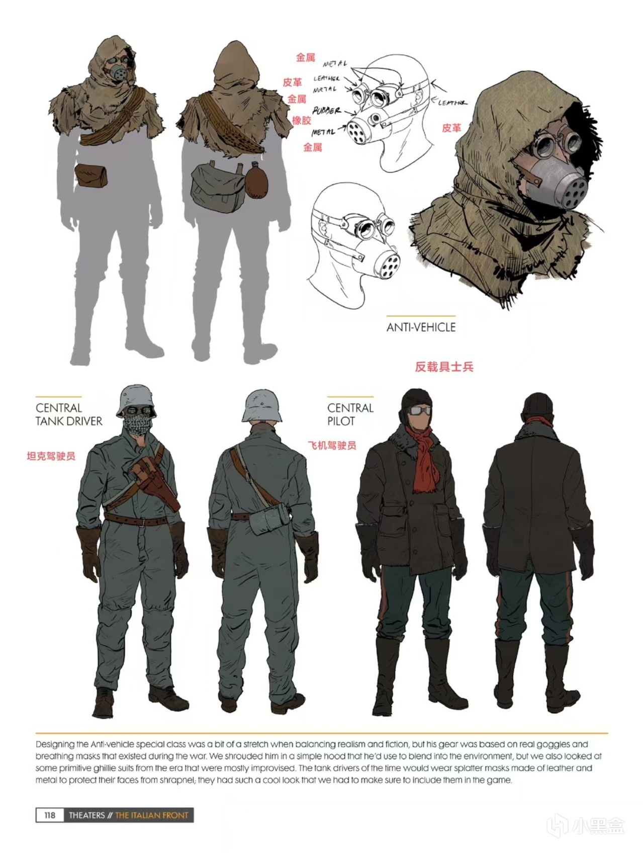 设计反装甲特种部队时,在现实主义与虚构元素之间取得平衡颇具挑战性。装备设计灵感源自二战期间实际存在的护目镜和呼吸面罩。我们为其设计了一顶简易头罩,以便融入环境,同时参考了该时代部分原始的吉利服,这些吉利服大多为临时拼凑而成。当时的坦克驾驶员会佩戴由皮革和金属制成的防溅面罩,以保护面部免受弹片伤害。这些面罩造型酷炫,因此我们必须确保在游戏中加入这一设计。
