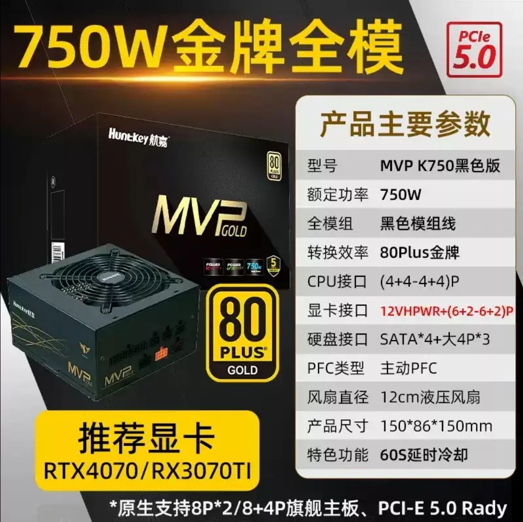 - 航嘉MVP K750金牌:750W金牌全模组,性价比突出,预留更多升级空间。