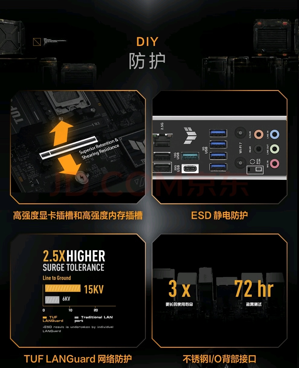 - 安全功能:包括高强度安全插槽和ESD静电防护,提升了主板的稳定性和安全性。