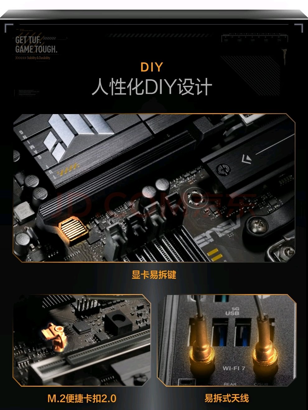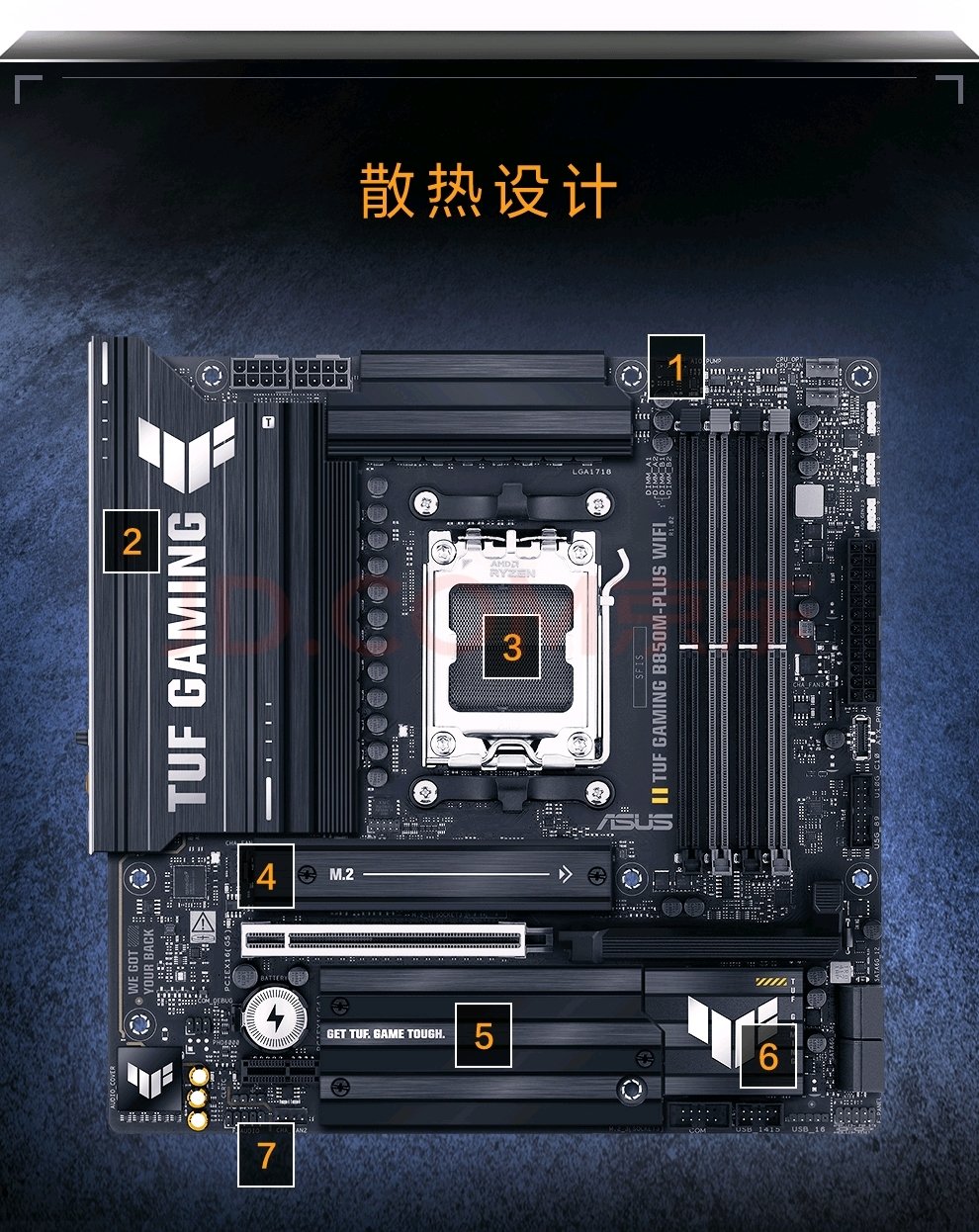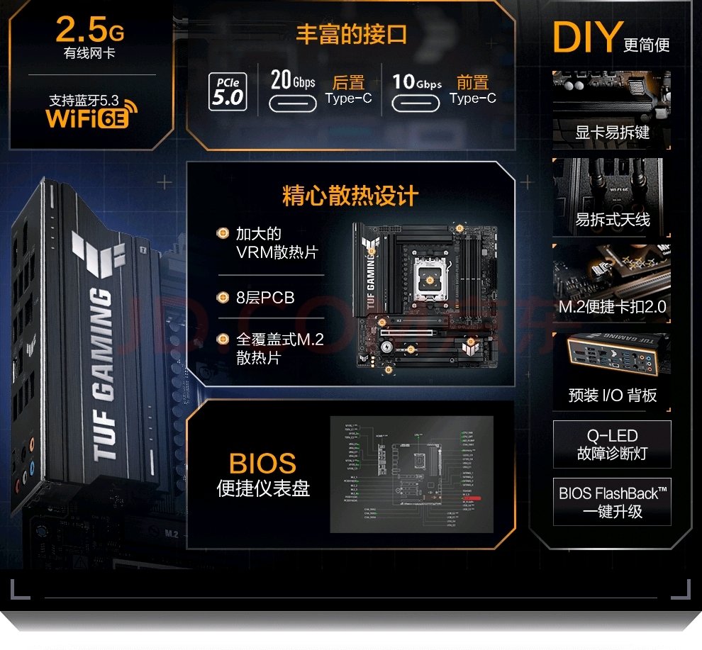 答∶华硕TUF B850主板(以TUF GAMING B850M-PLUS WIFI为例)的固态硬盘插槽配置如下: