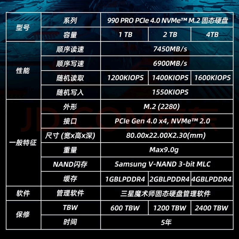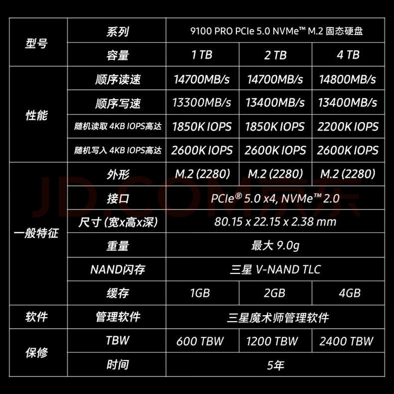 - 三星990 PRO 2TB:顺序读取速度约7450MB/s,具备独立缓存设计和NVMe PCIe 4.0技术,工作温度范围宽广,耐久度为1200TBW,适合长时间稳定运行。