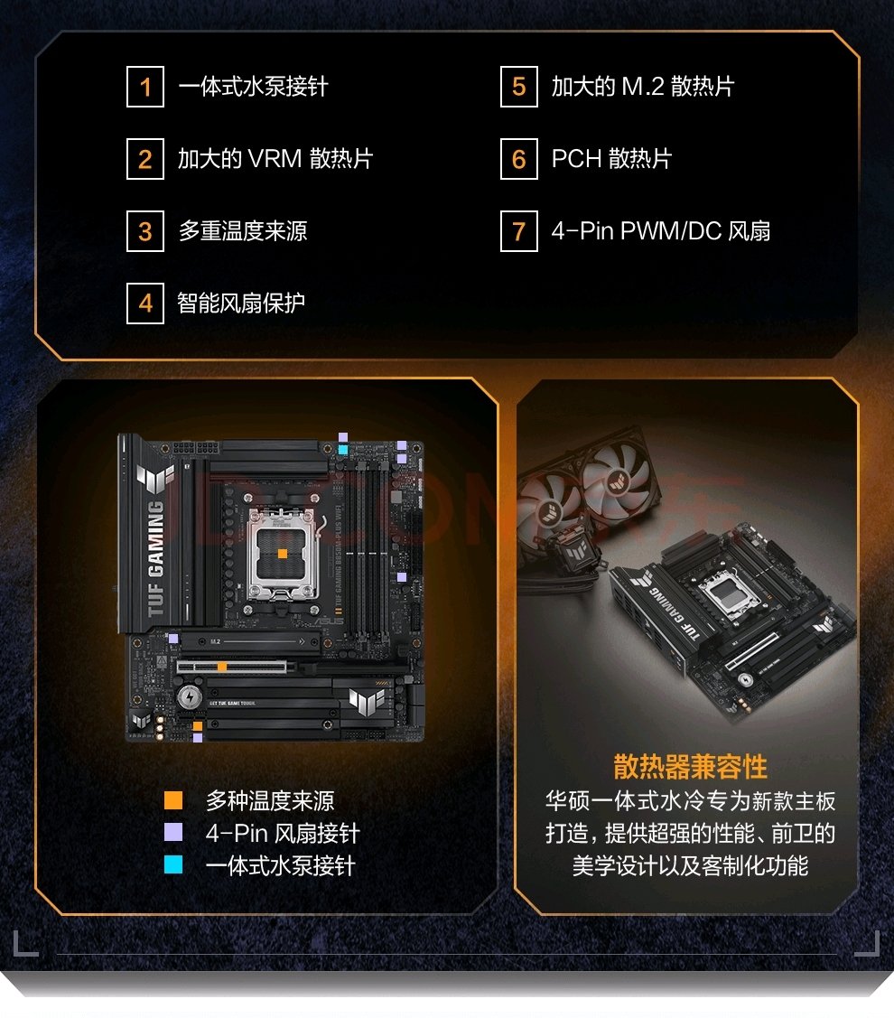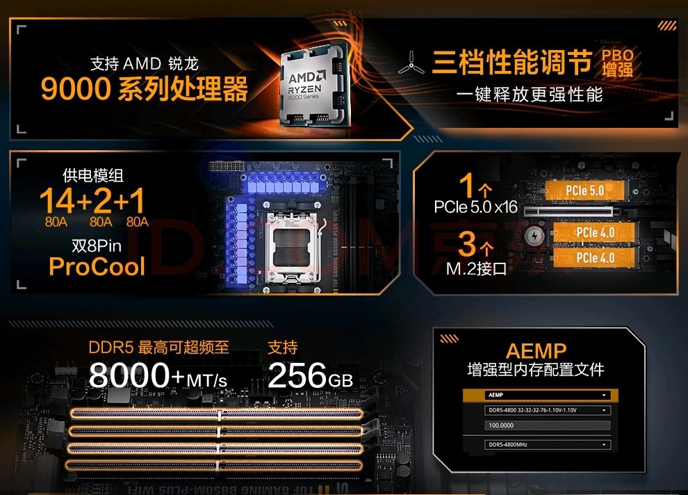 - AMD锐龙9 9950X3D:华硕TUF B850主板的供电和散热设计使其具备支持9950X3D的潜力。尽管9950X3D对主板的供电和散热提出了更高的要求,但该主板在理论上可以满足其基本需求。建议在使用时关注CPU的温度和功耗表现,并根据需要进行适当的调整。