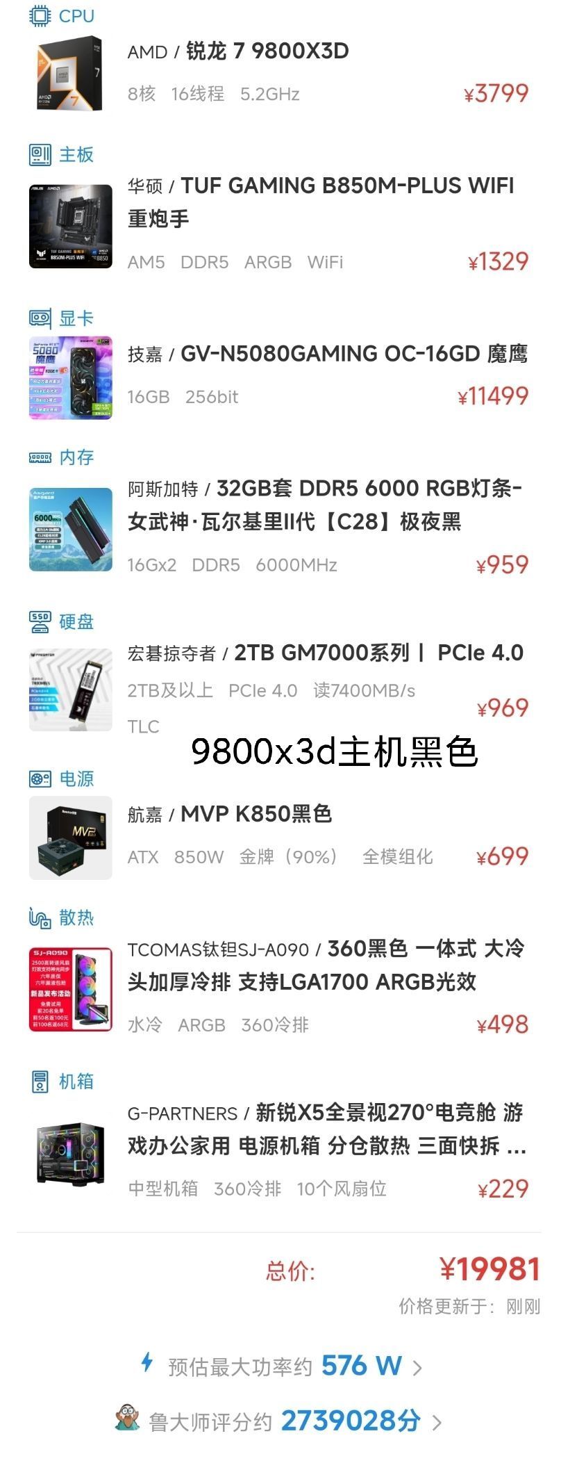 - 功耗分析:9800X3D满载功耗约142W,搭配RTX 5080等显卡时,整体功耗约600-700W。