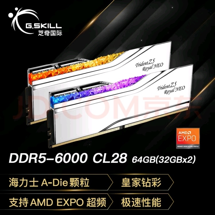 -G.SKILL芝奇(G.SKILL)64GB(32GBx2)套装 DDR5 6000频率 台式机内存条-皇家戟EXPO版RGB灯条-银色/C28。