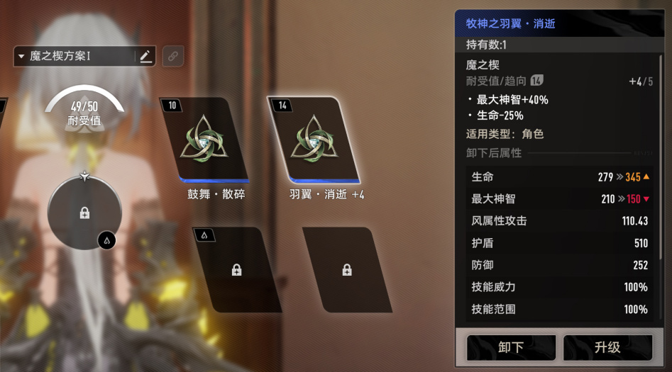 與常規二遊的重數值不同,魔之楔提供的效果,除了常規的增加數值之外,還有一些如“最大神智”(角色藍量)、“技能效益”(影響技能耗藍多少)、“技能耐久”(影響技能效果時長)能引起角色質變,只要稍加組合,就能實現很多Rougue遊戲中,永動機一般的奇妙BD。