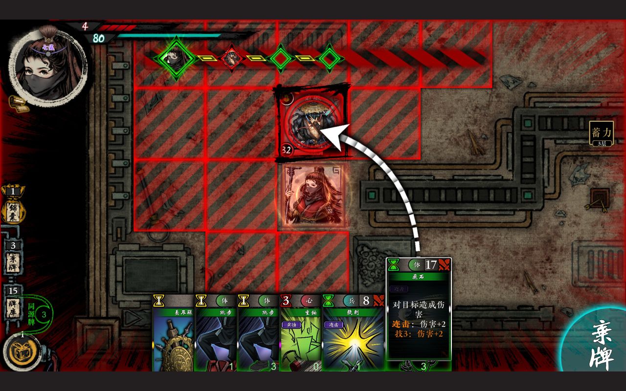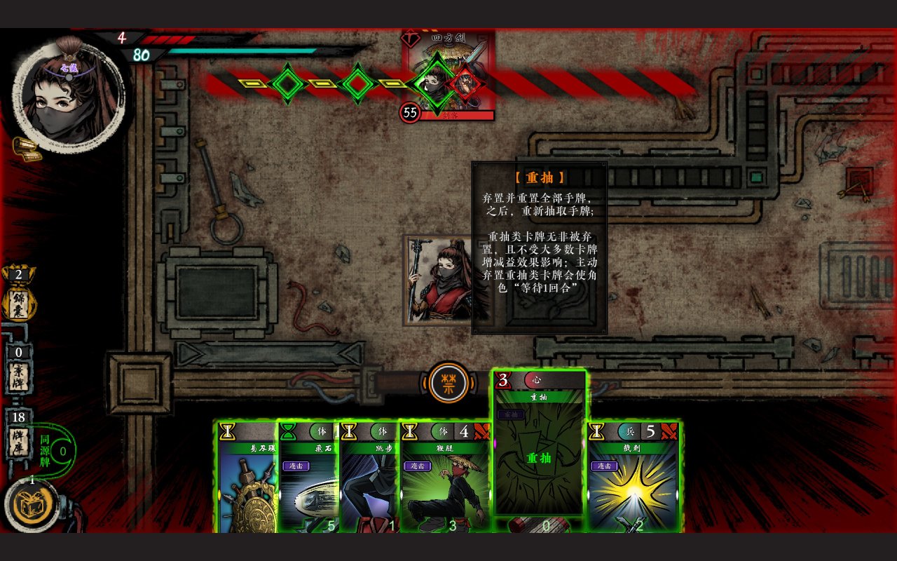 在《诸子亡秦》里没有传统的回合抽牌、弃牌概念(毕竟是以回合制战棋为基底),当玩家打出一张装备牌以后将在下回合自动替换成装备组下面的卡牌,如果全部卡牌都被用掉你将进入无牌可打的状态——这时候需要用「重抽牌」进行手动重置。