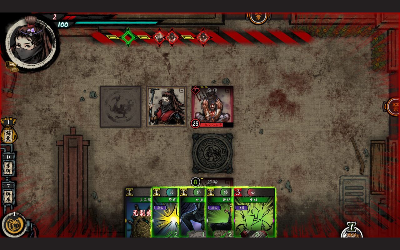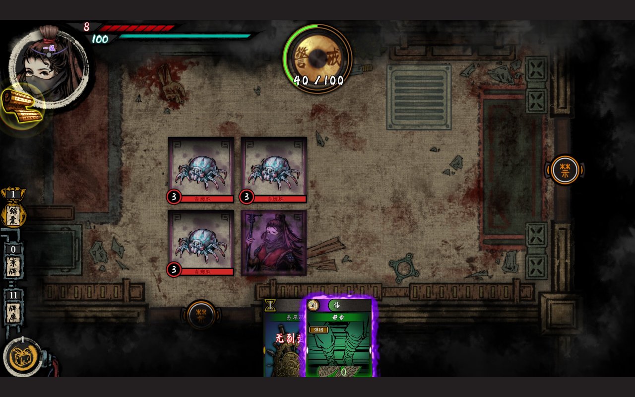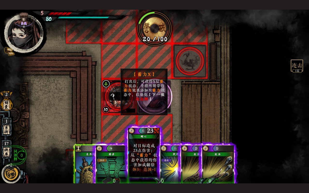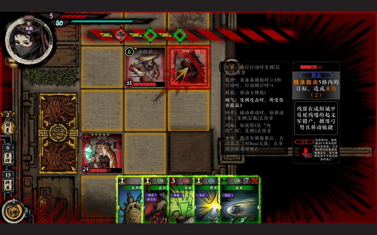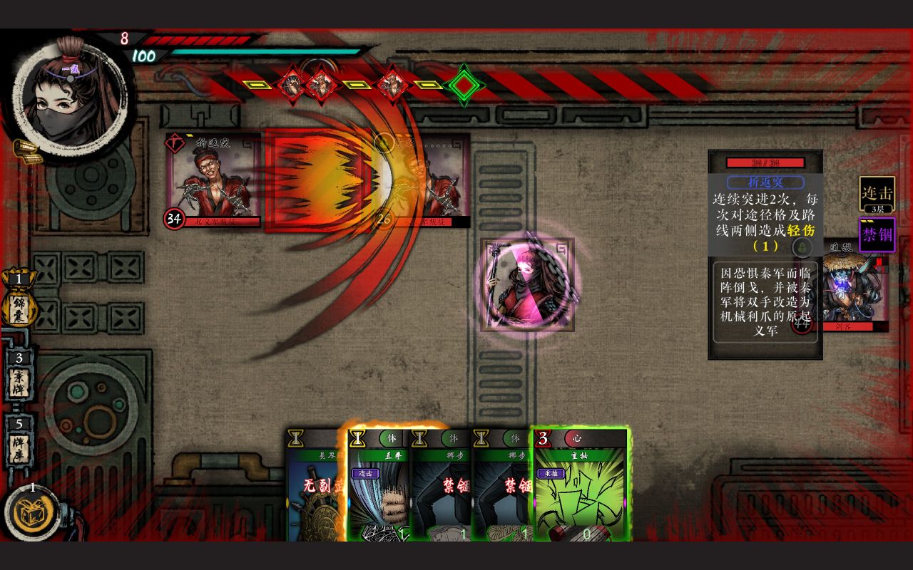 兴许是觉得敌人意图的指示太明显、再加上攻击前摇过长,玩家很轻松就能依靠卡牌搭配打出无伤,因此《诸子亡秦》有一个我觉得可能会引起争议的设计:低血量容错,并且几乎没有太多回复手段。