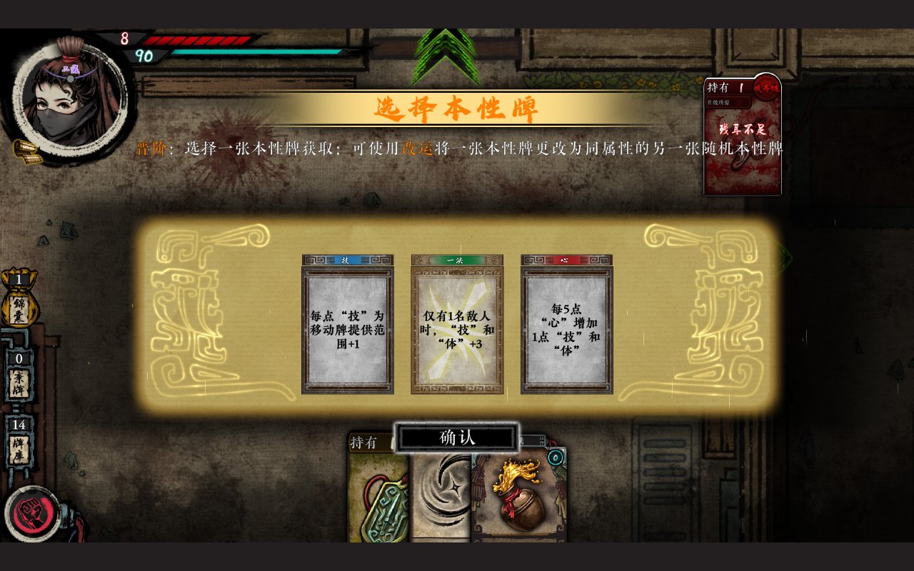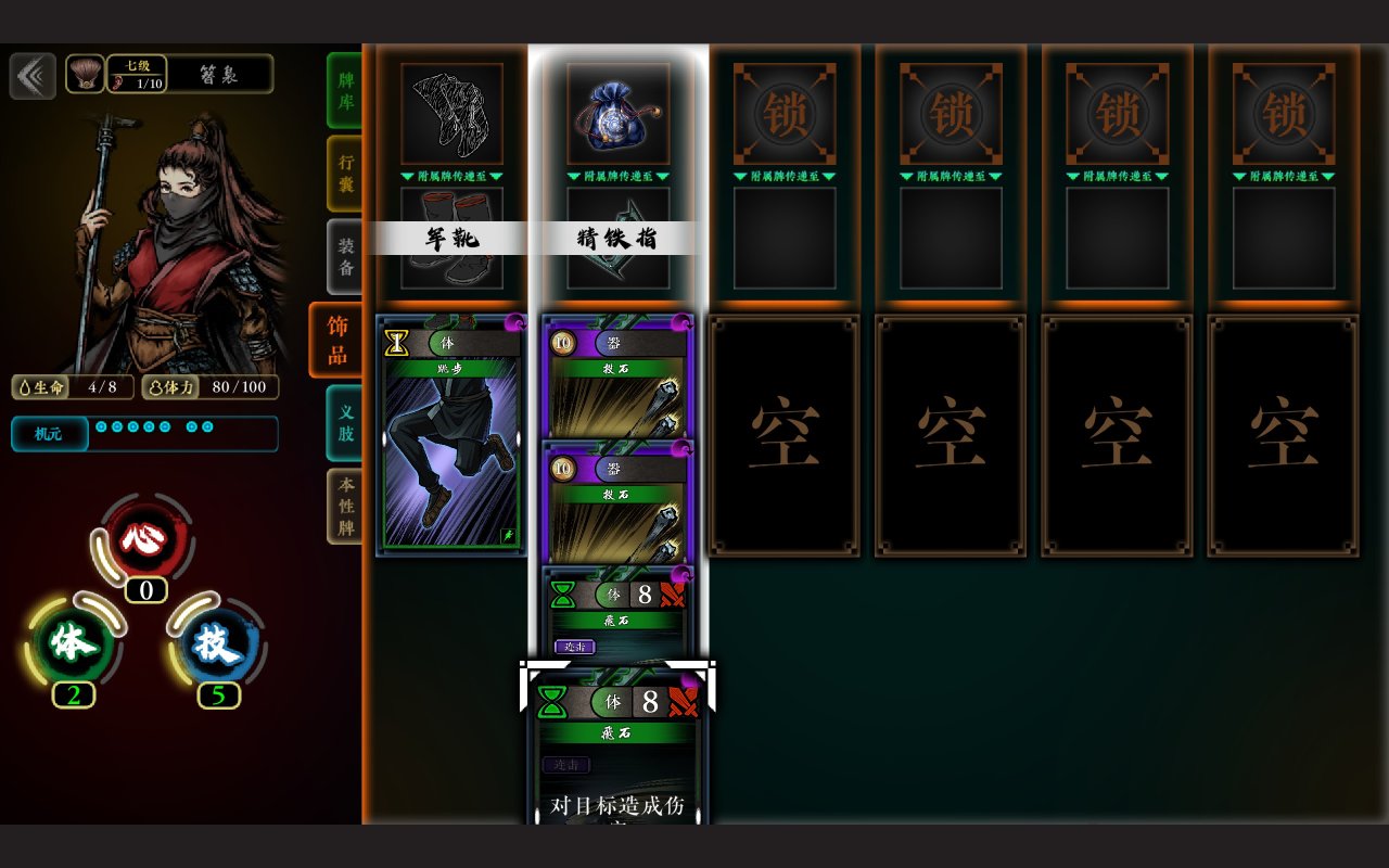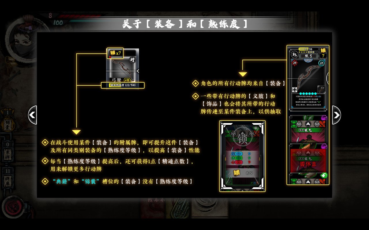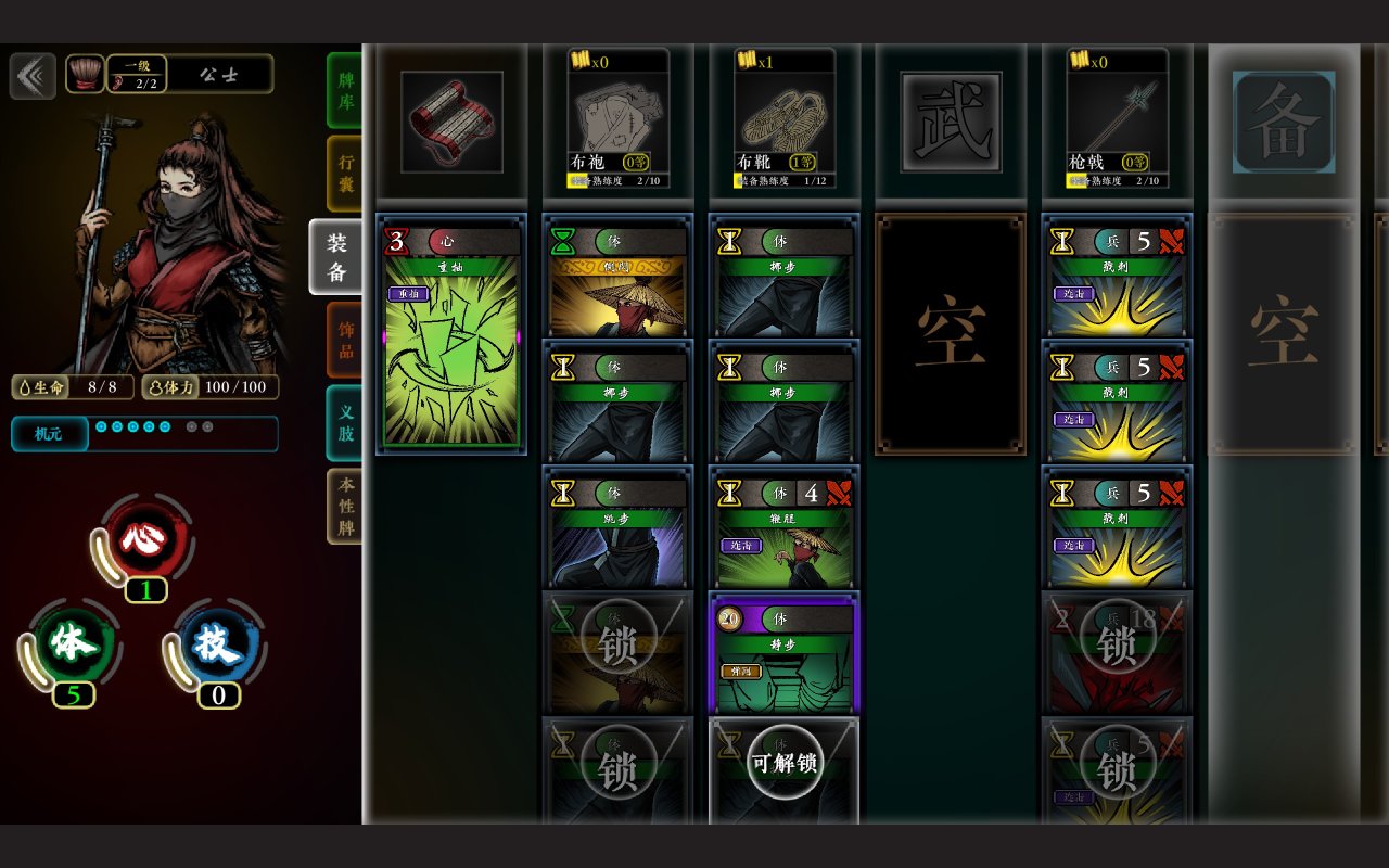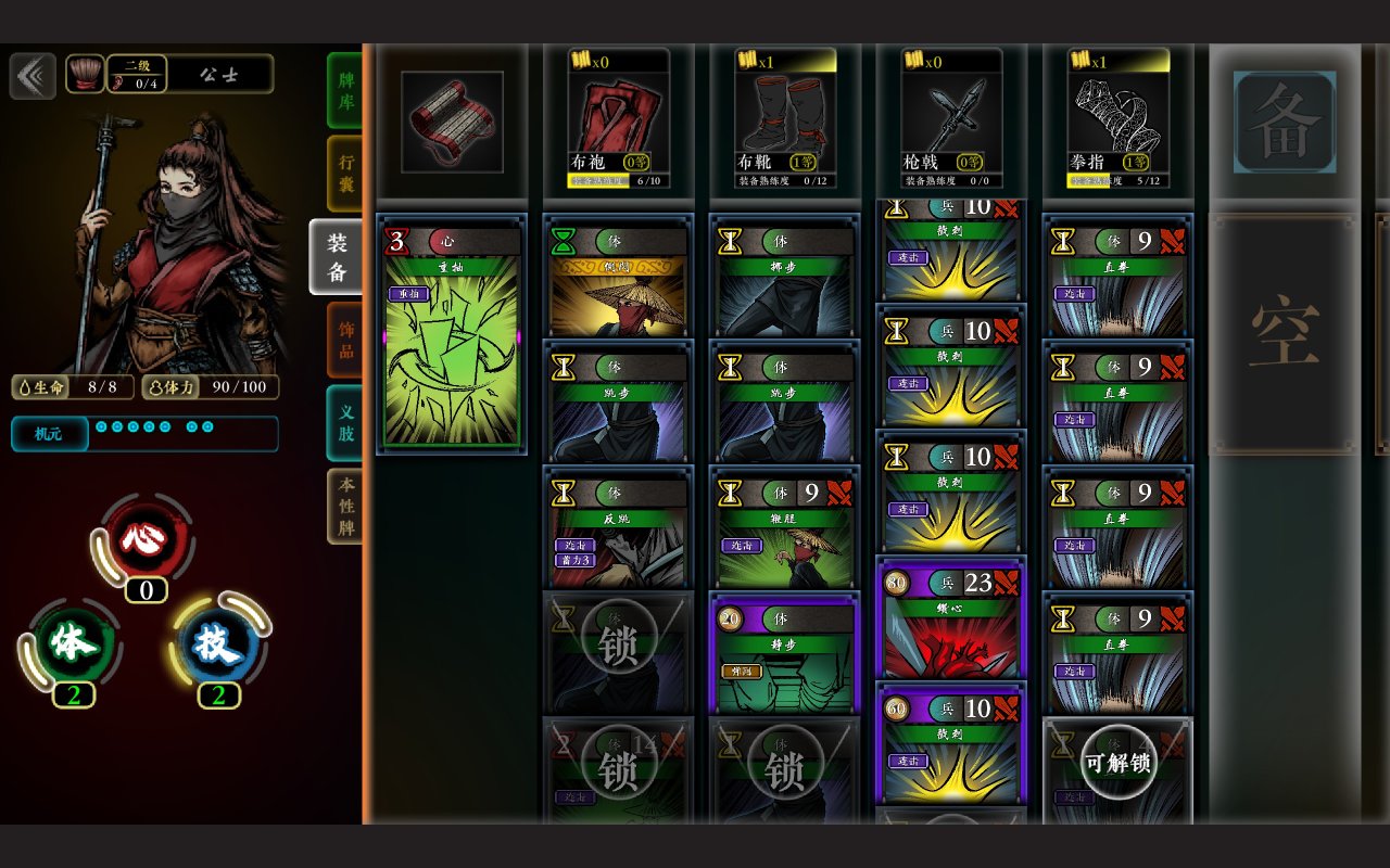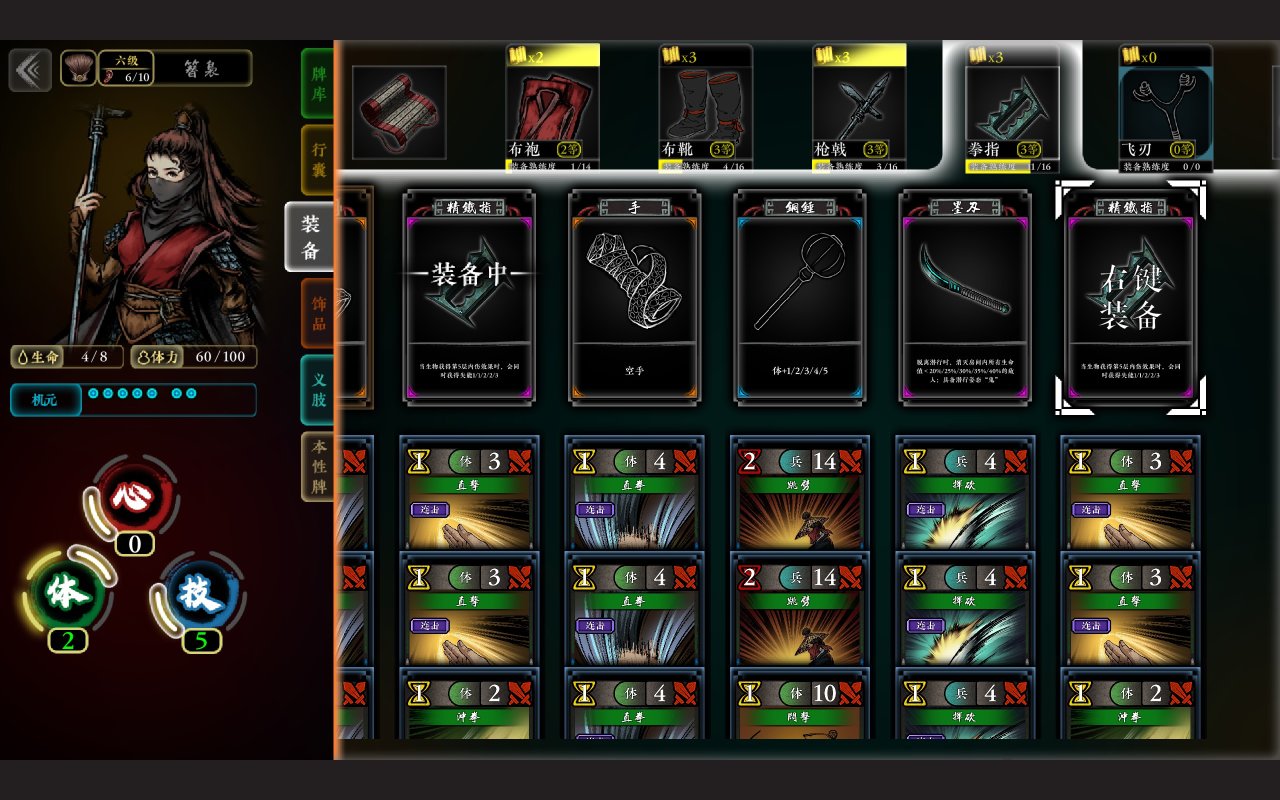 这个其实无形中隐去了「牌库污染」概念,因为玩家已经没有了增删牌的空间,上限被「装备栏」牢牢锁住——要是你觉得某个卡牌用起来不顺手咋办?换个趁手的兵器就行了!