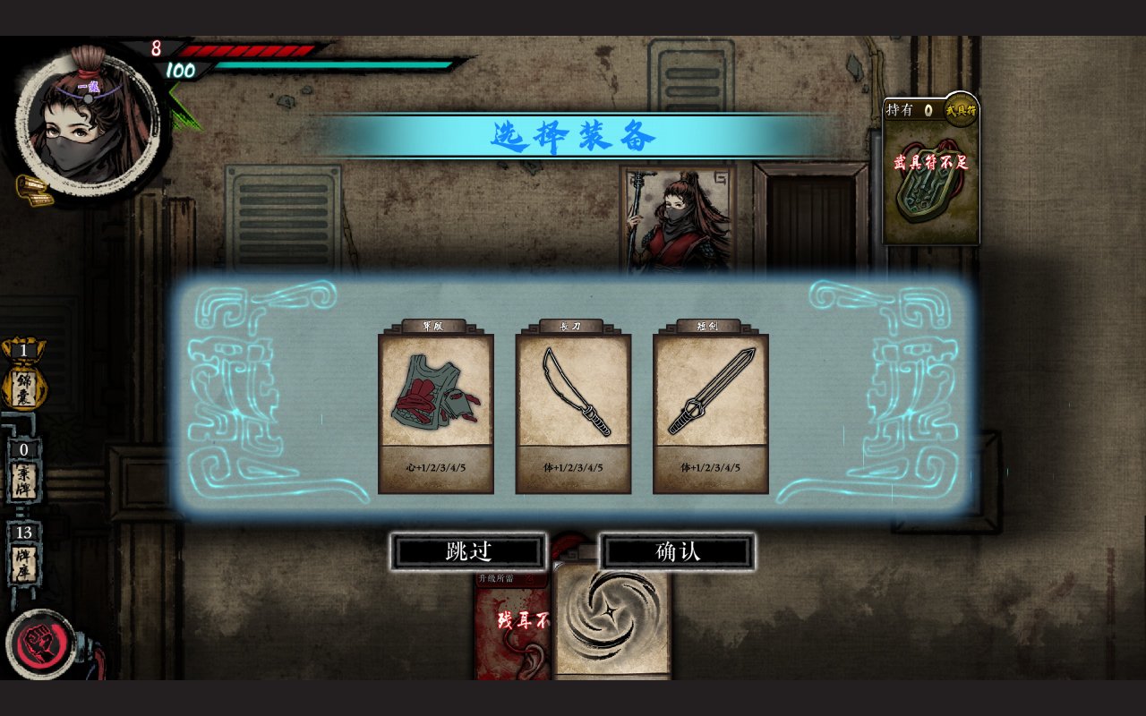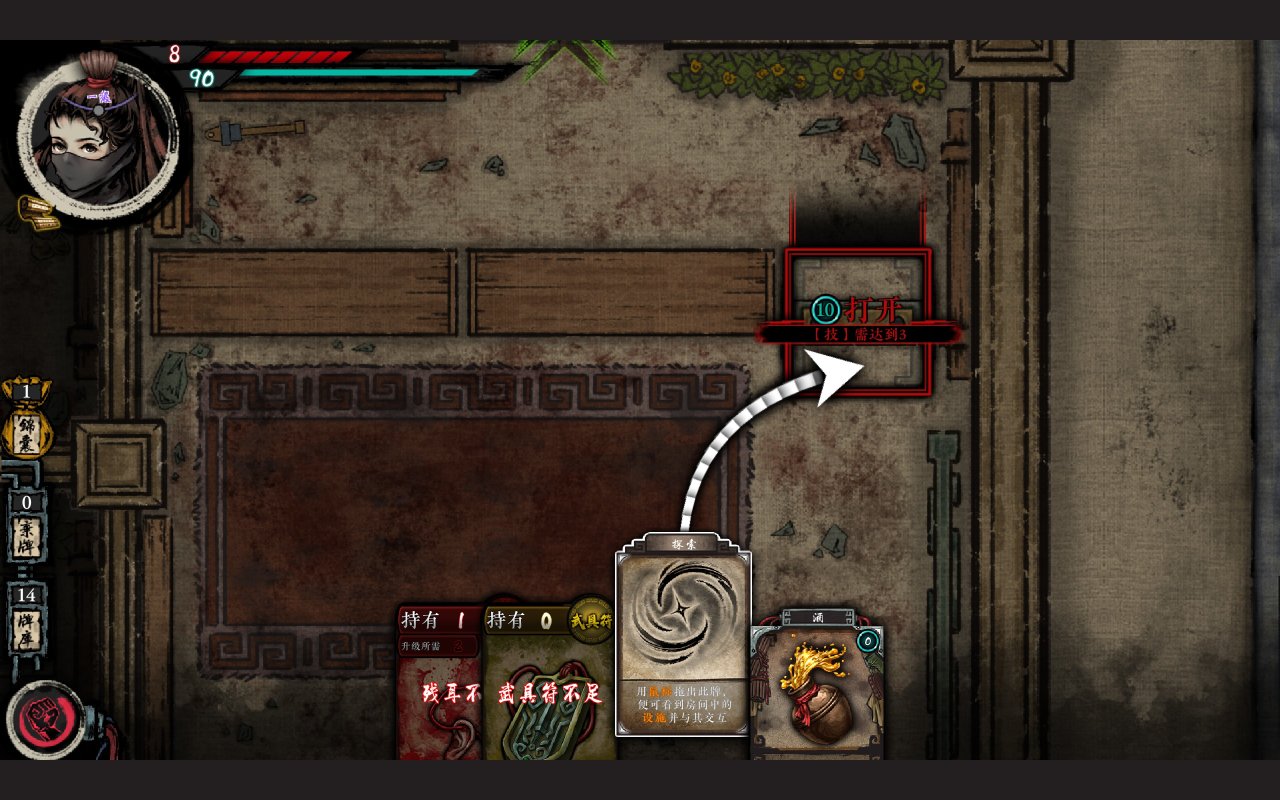 如果房间里没有敌人,玩家将进入「探索」模式,可以使用手中的探索跟武具牌跟场景互动,搜刮一些装备跟资源——而这将会是之后战斗的核心所在,毕竟合格的刺客手上肯定要有趁手的兵刃!!