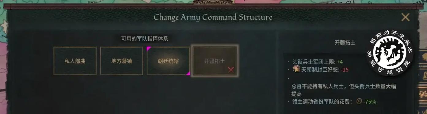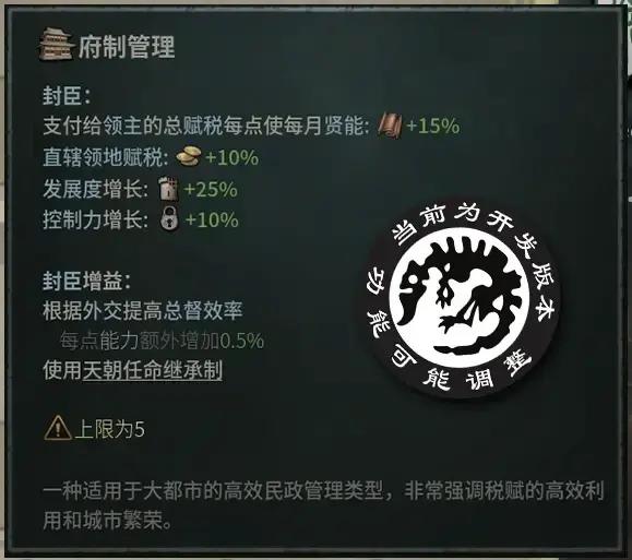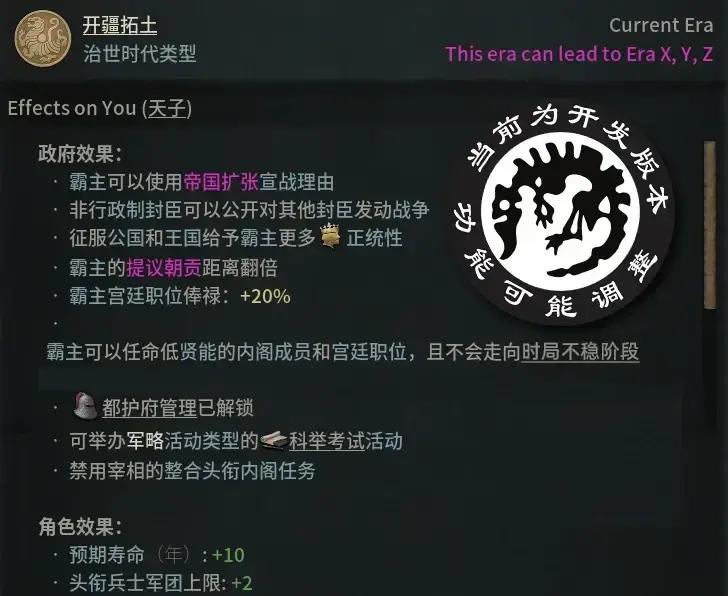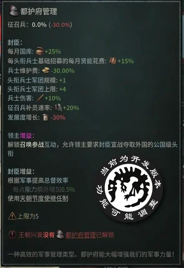 以及僅限於開疆拓土時代,位於漢地之外,聽命於皇帝,獨立擴張自己領地的,僅限5個的都護府。雖然降低了30%的發展度增長,但是換取了頭銜軍團上限加四,規模上限加一和補員速率等強力buff。