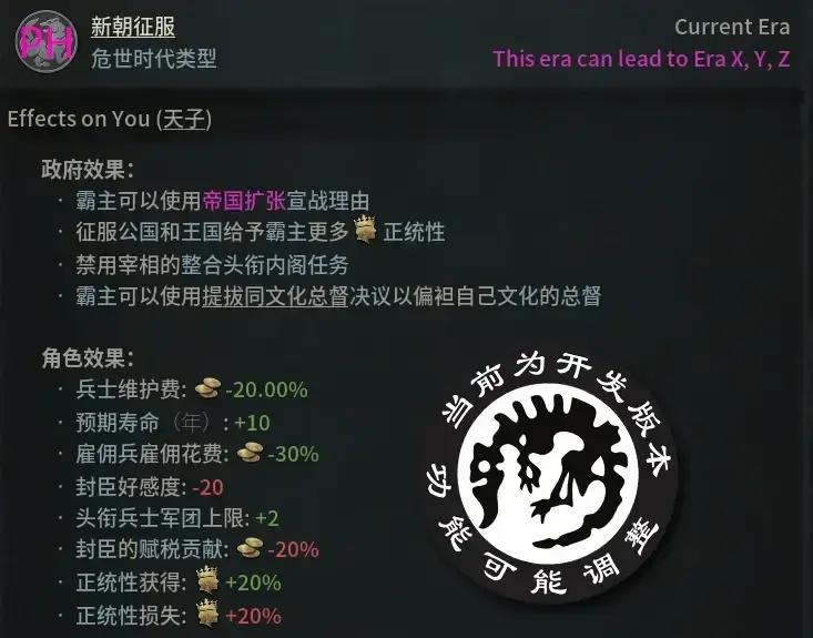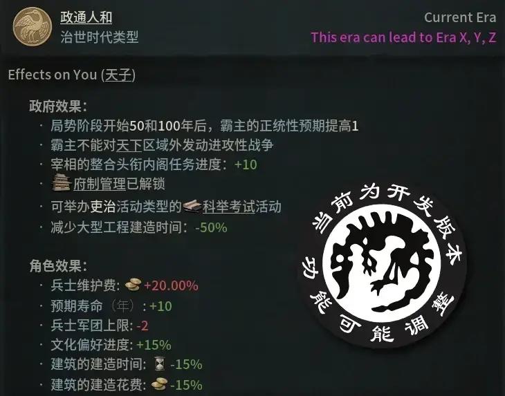 每種時代都會各以其顯著的方式影響身處中華的角色。我們的目標除角色和伯爵領的常規修正外,還包括賦予每種時代各自能解鎖的、獨特且實用的事物。