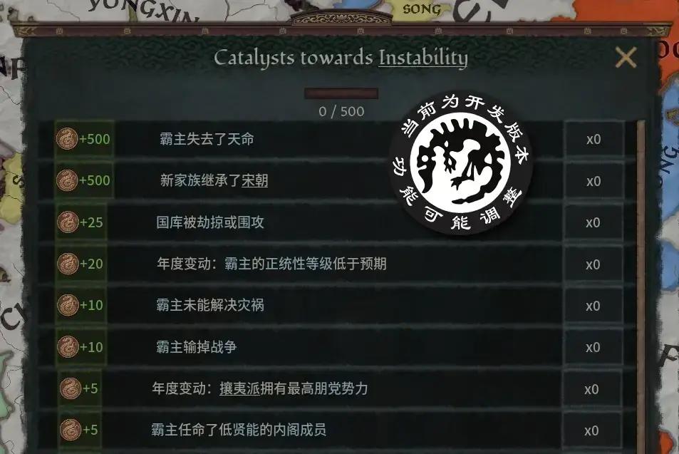 泉南石:這裏可以注意到,失去天命即正統歸零以及更換統治者家族可以直接從政通人和推進到危世,曹公玩家可以從這方面去做文章了。比如不小心勾引了皇后之類的說不定就能造成一個巧妙的意外,讓你的孩子繼承宋朝。