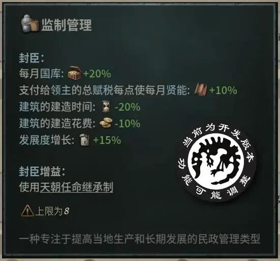 泉南石:監的機制很可能是封臣玩家要優先爭取的,如果流官並不頻繁或者說沒有流官制度,監的效果有助於種地型玩家在前期就能高速種地進行原始積累。