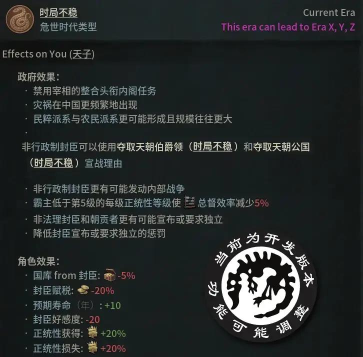 泉南石:時局不穩的效果感覺非常普通,除開這個:”災禍”的概念是首次提到。目前還不確定災禍的具體效果以及之前日誌所說應對的偉大工程效果,如果buff疊得夠多,很可能在某種特定情況下時局不穩會更多災禍,進而更多偉大工程,從而獲得比治世時代更好的buff。