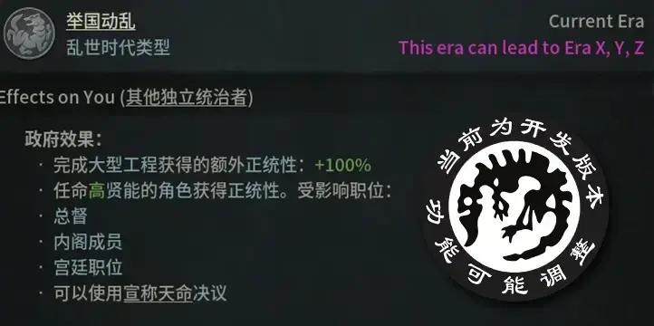 皇帝的正統性類型爲新的設定——天命。該設定會有額外的觸發條件和預期。若正統性低於預期,那麼天命的權威就會受到質疑。