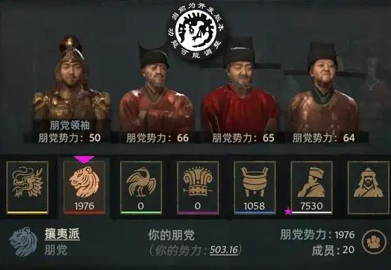 4.朋黨的影響力被稱爲朋黨勢力,是所有成員的個人朋黨勢力總和。積累賢能、總督特質經驗、年齡可以永久提高該數值。而政治計謀、軍力和門生可以暫時提高該數值。
