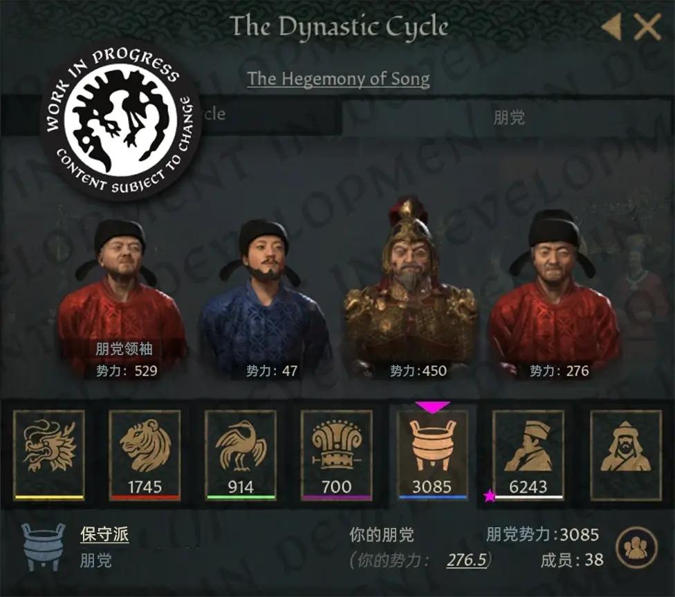 與拜占庭不同,中華的官員們可以分享超越個人目標的價值觀。我們利用局勢參與者羣組功能,在王朝興衰局勢中創建了四種不同的朋黨。