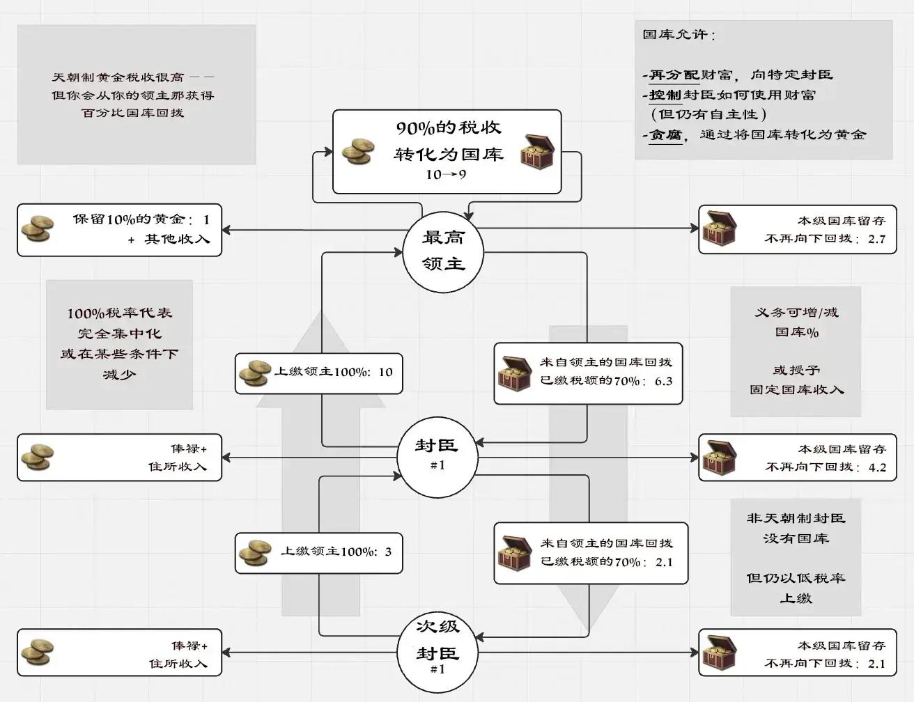 3.最後皇帝再按照每個封臣的所徵稅額和封臣契約義務等因素,將國庫的資金回撥給所有總督。總督再下發到其下級封臣。邊疆總督由於要維護龐大的軍隊,因此下發的資金反倒比上繳的稅額多。