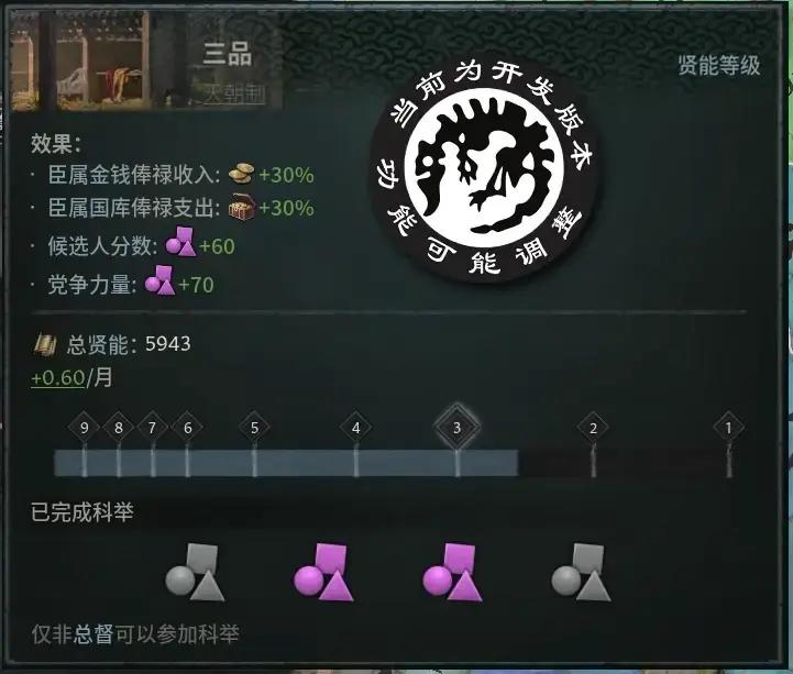 2.角色在任職期間的稅收規模和軍隊規模決定了其在此職位上獲得多少賢能。