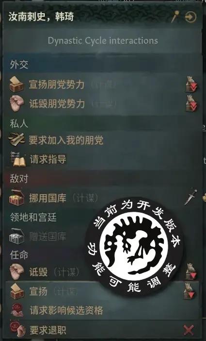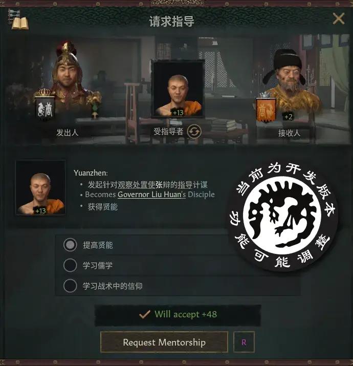 5.恩師和門生將會作爲新的關係加入到遊戲中。門生的賢能必須低於恩師,不然就無法成功拜師或出師。加入你的朋黨,或者通過政治計謀予以指導都能獲得門生。門生還會將其朋黨勢力借給恩師。