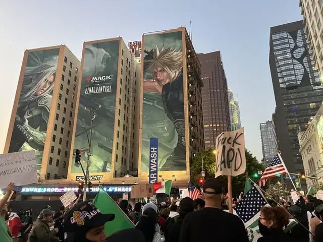 曾作为E3兵家必争广告位的菲格罗亚酒店,在这次游戏节期间被万智牌包下,用于宣传与《最终幻想》系列的联动。而就在这几栋楼的楼下,同样聚集着大量的抗议者。