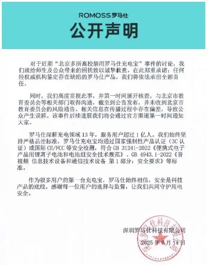 当日下午,深圳罗马仕科技有限公司在官方微博发布公开声明:对于因该事件给师生及公众带来的困扰,表示“诚挚歉意”;并郑重承诺,任何经“权威机构鉴定存在缺陷”的罗马仕产品,公司将依法承担全部责任。同时,罗马仕称已第一时间启动内部核查,并与北京市教育委员会等相关部门取得沟通,截至声明发布未接到官方风险通告,后续进展将通过官方渠道及时发布。