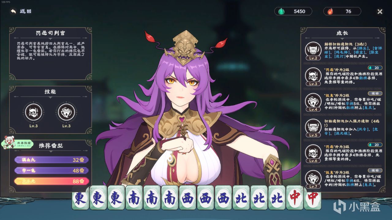 舉個Build例子,我最喜歡的“打字姬”,罰惡司判官鍾馗。她在遊戲中的被動技能效果爲:整輪遊戲中,每累計喫/碰/槓牌達到一定次數,就可以爲一張隨機的數字牌永久附上“鬼靈”。鬼靈的效果是讓該牌變成隨機的字牌(四種風牌和發財紅中白板)。