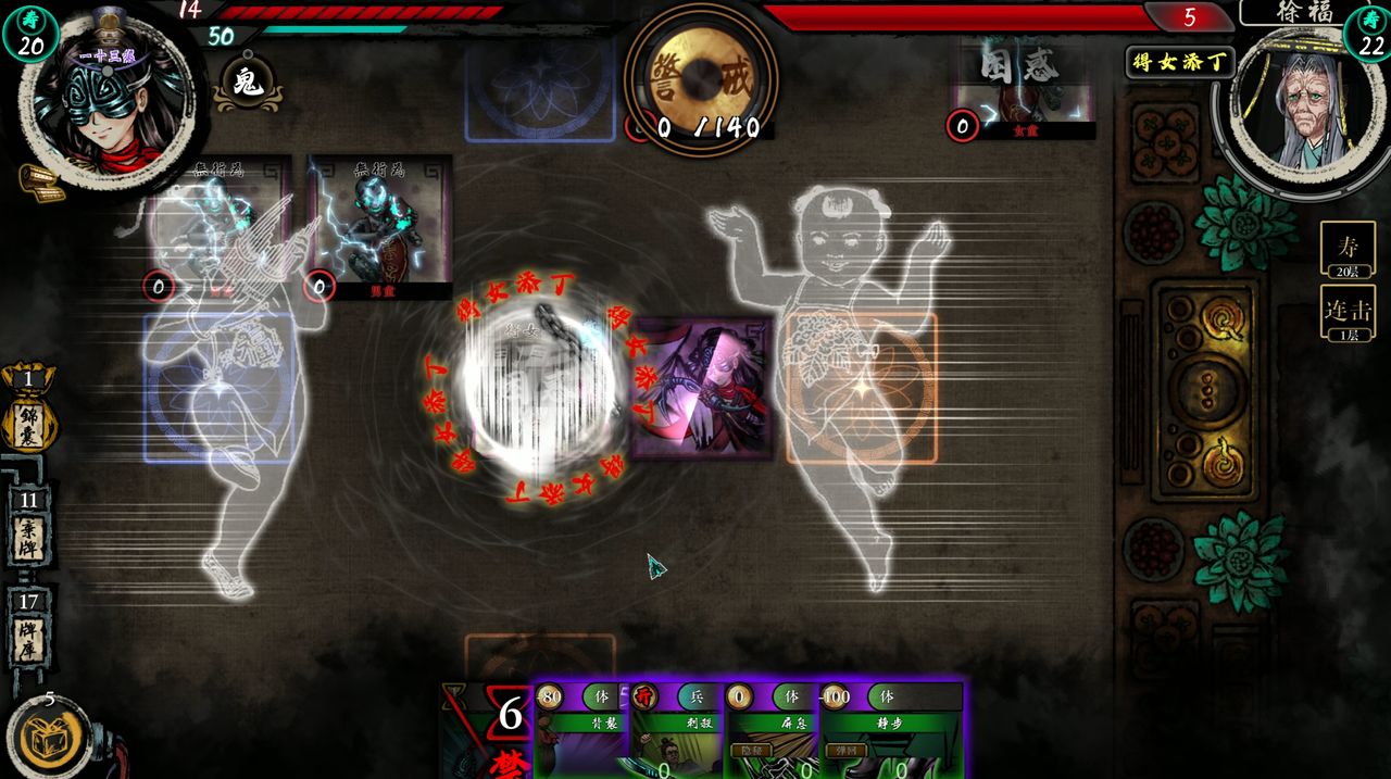 在直面敵人進行戰鬥時,每一回合會從裝備構築的卡組中抽出固定數量的卡牌,並通過“心法牌”達成手中卡牌的滾動循環。