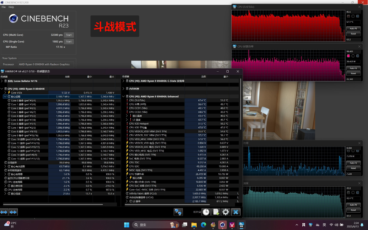 斗战模式下,CineBench R23单核跑分为1882分,多核分数为32300分。