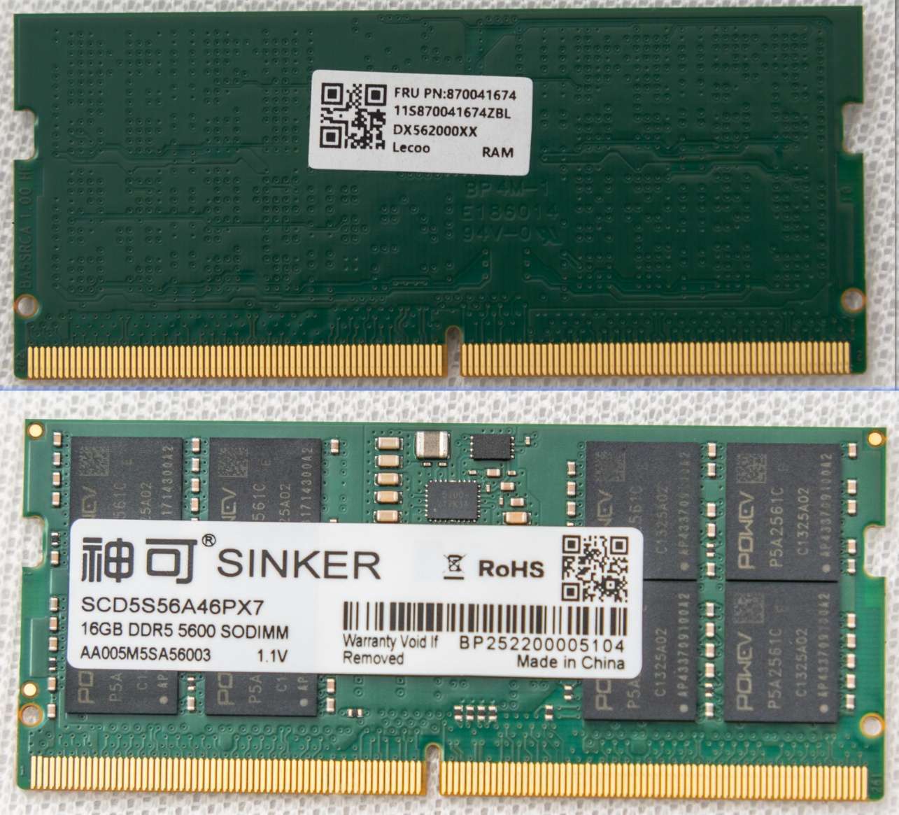 战7000预装一条16GB 5600规格内存条,品牌为神可,颗粒封装标记为嘉合劲威POWEV,深圳的一家国产颗粒品牌。