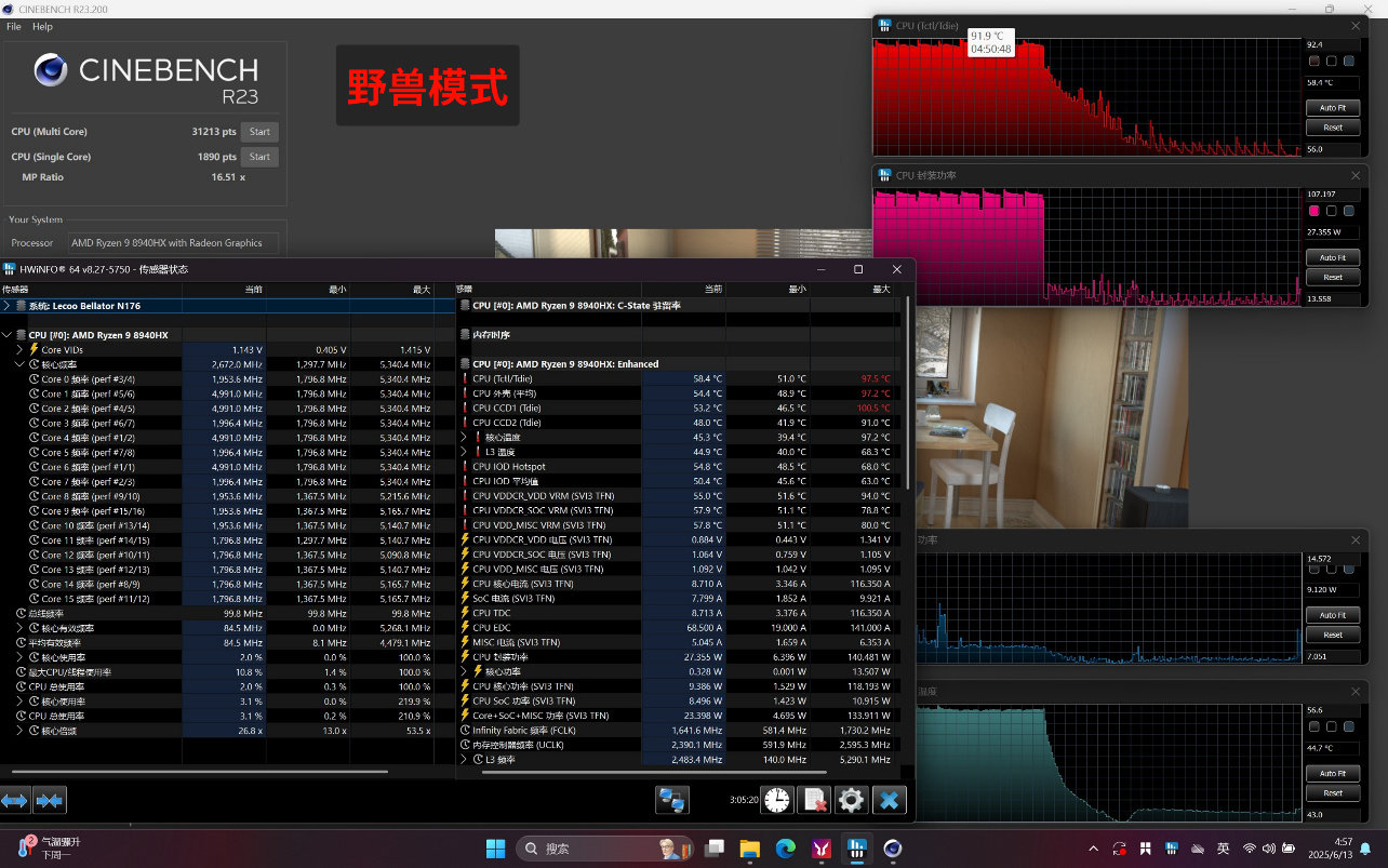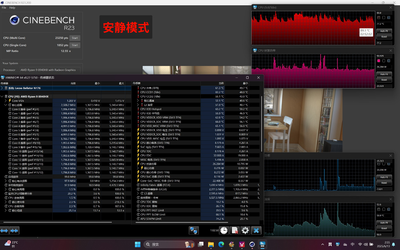 单核跑分反而比野兽模式低80分(这里推测是 8940HX 这颗 zen4 架构的5nm芯片,更高温度下积热影响单核性能)