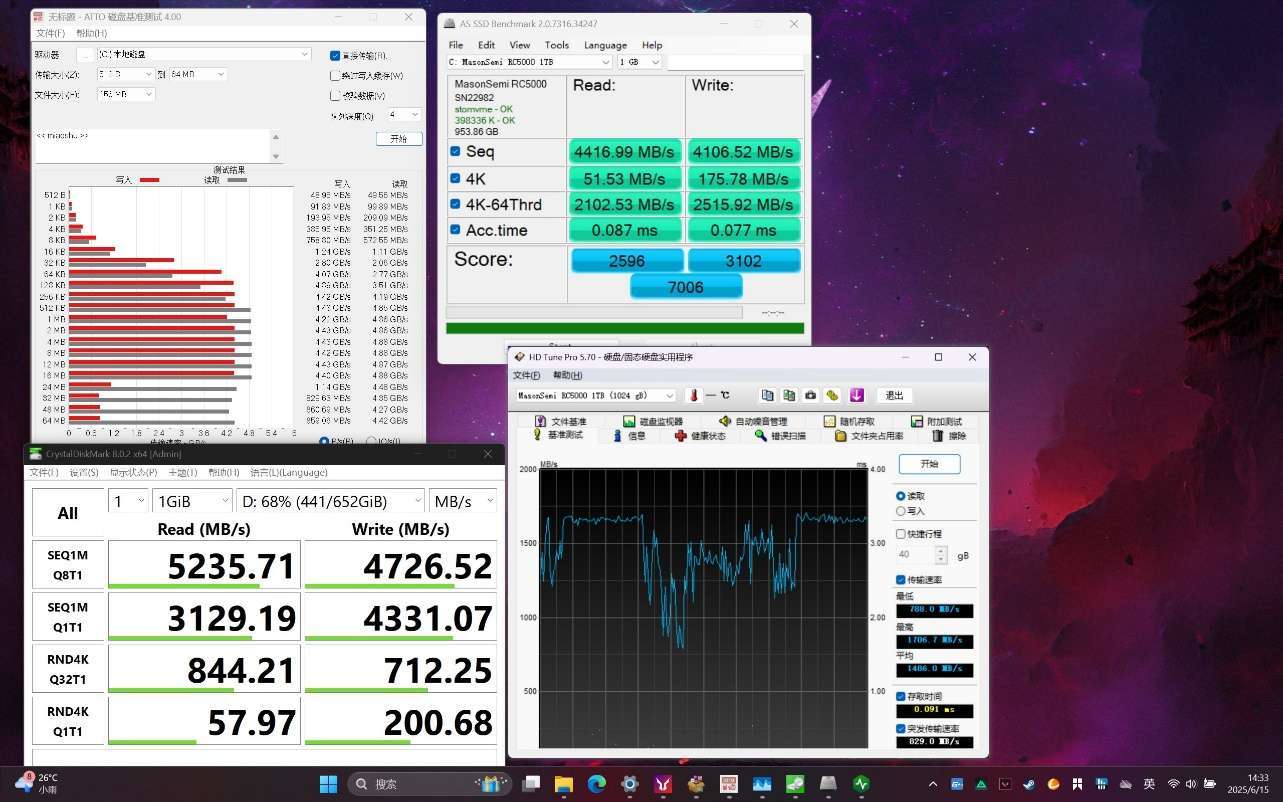硬盘型号是MasonSemi RC5000,PCIe 4.0速率,TLC颗粒,跑分测试如图。