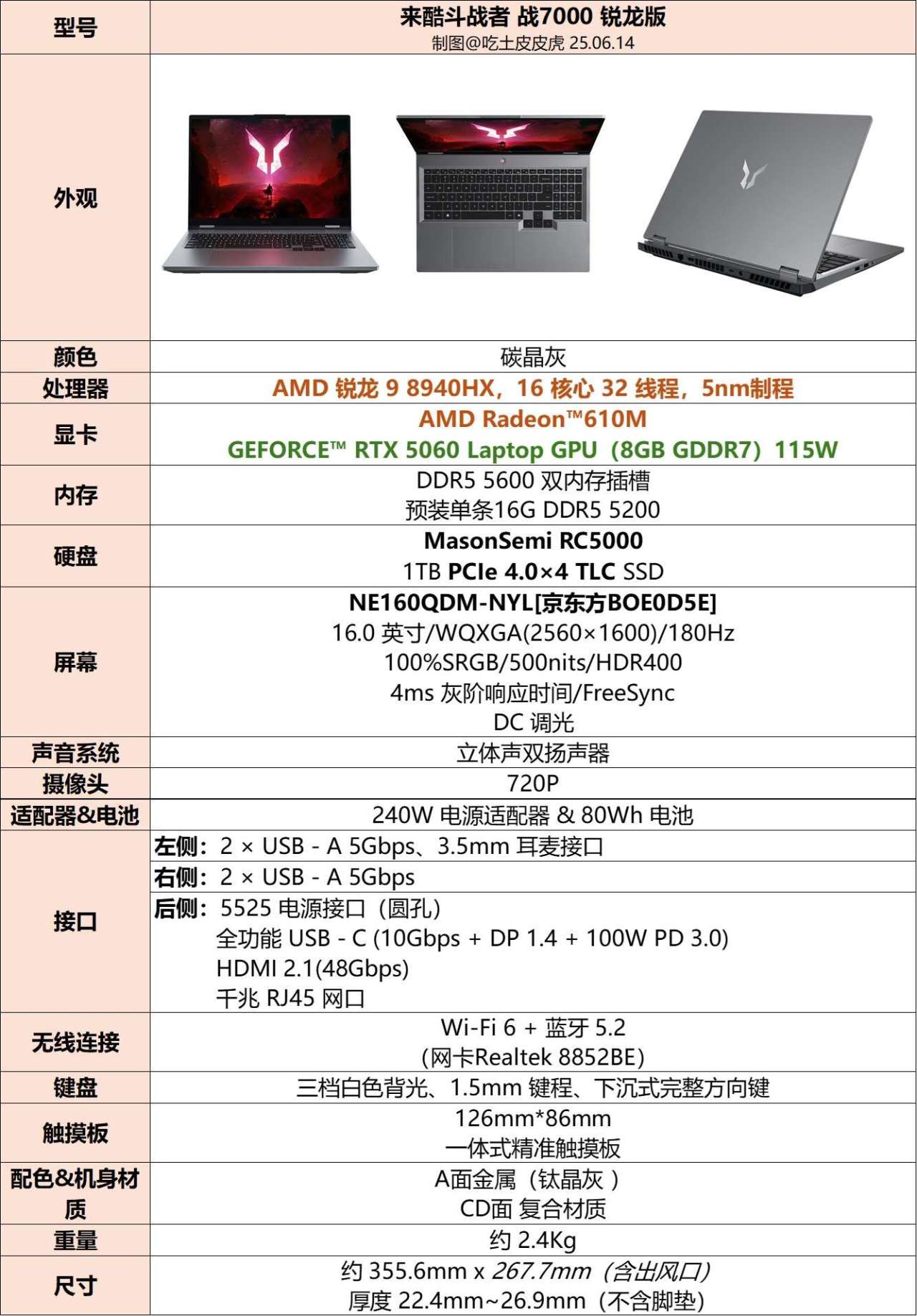 斗战者 战7000 锐龙版,核心配置,看齐一线主流厂商。