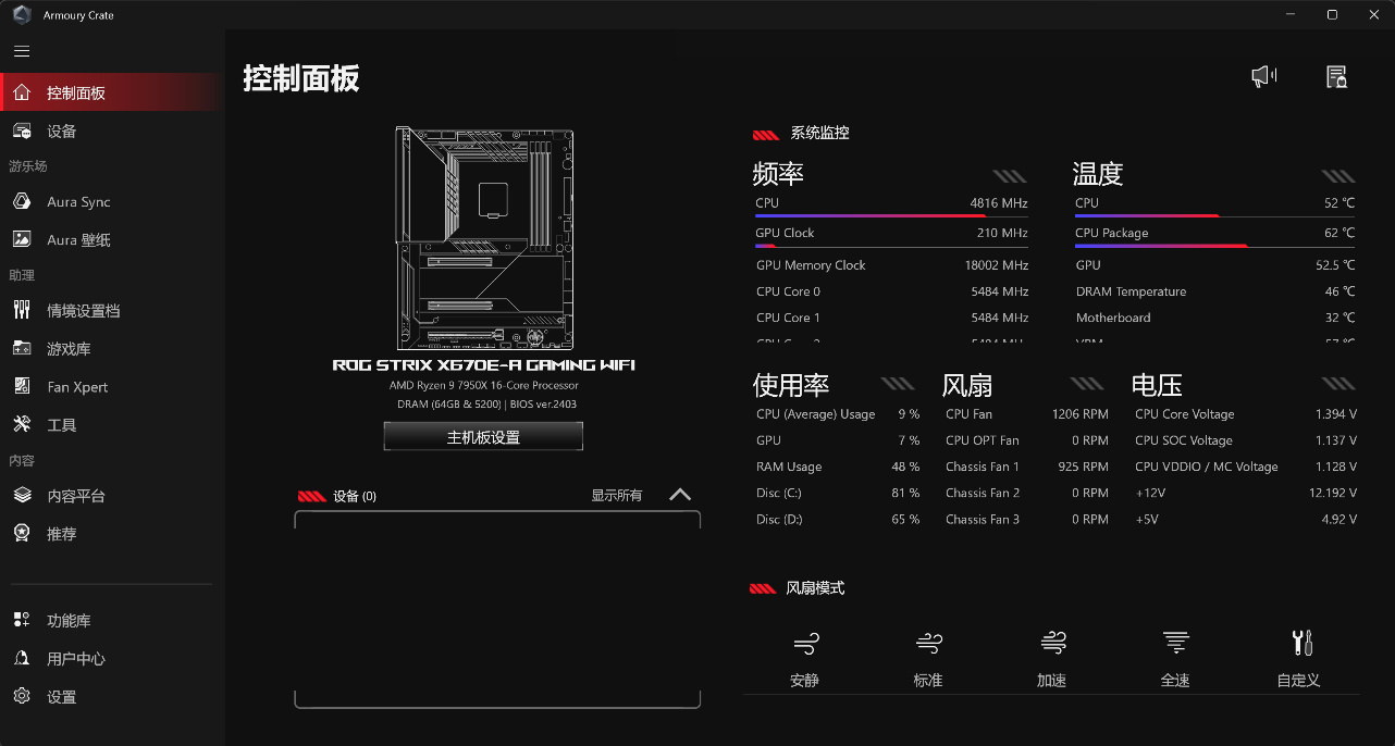 从有效信息的集成度来看,这不吊打ROG的Armoury Crate?后者连芯片功率都不显示,风扇现在是啥模式都不显示的。