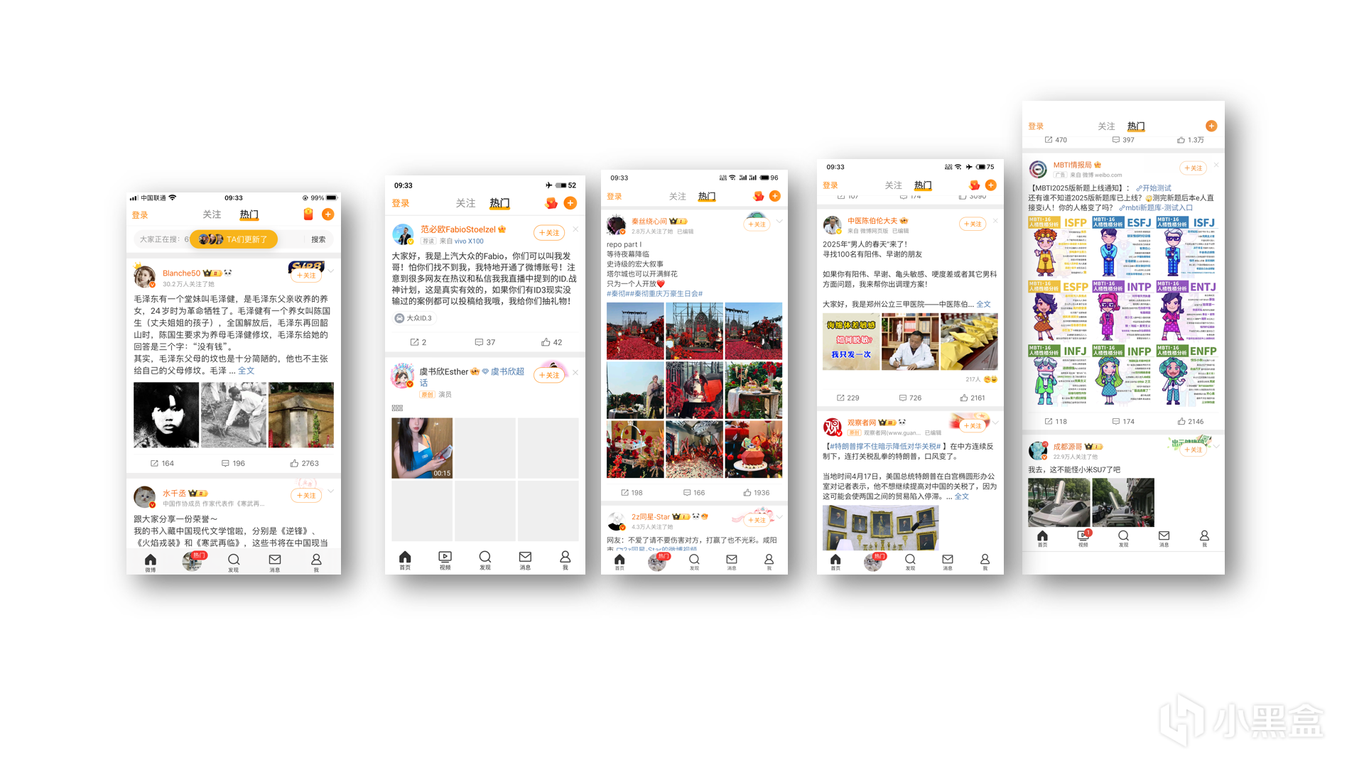 然后是微博 ,可以看到五台手机的画面没有明显差异 。