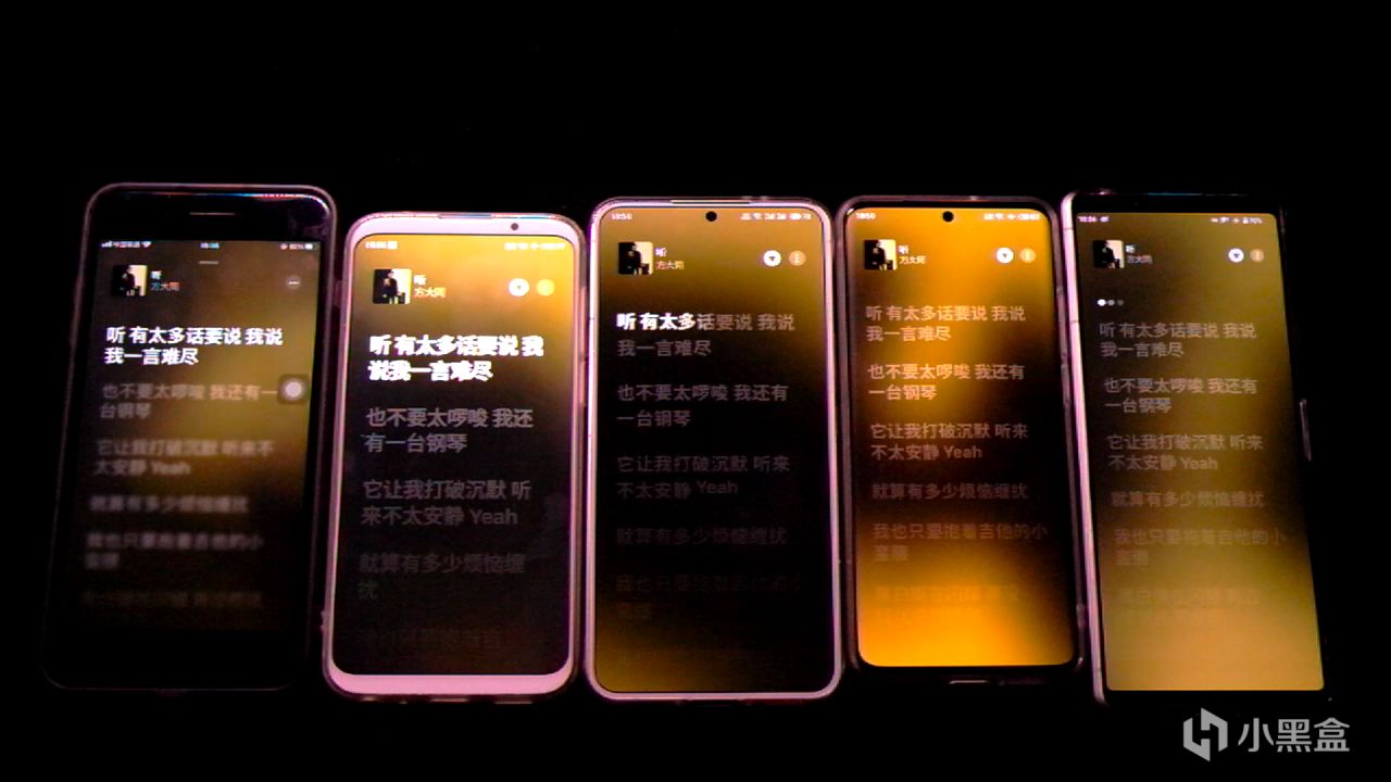 最后是Apple Music ,表面上五台手机也没有明显差异 ,但需要特别指出的是 21:9的手机在显示沉浸歌词时是五台手机里效果最好的 ,屏幕利用率很高。