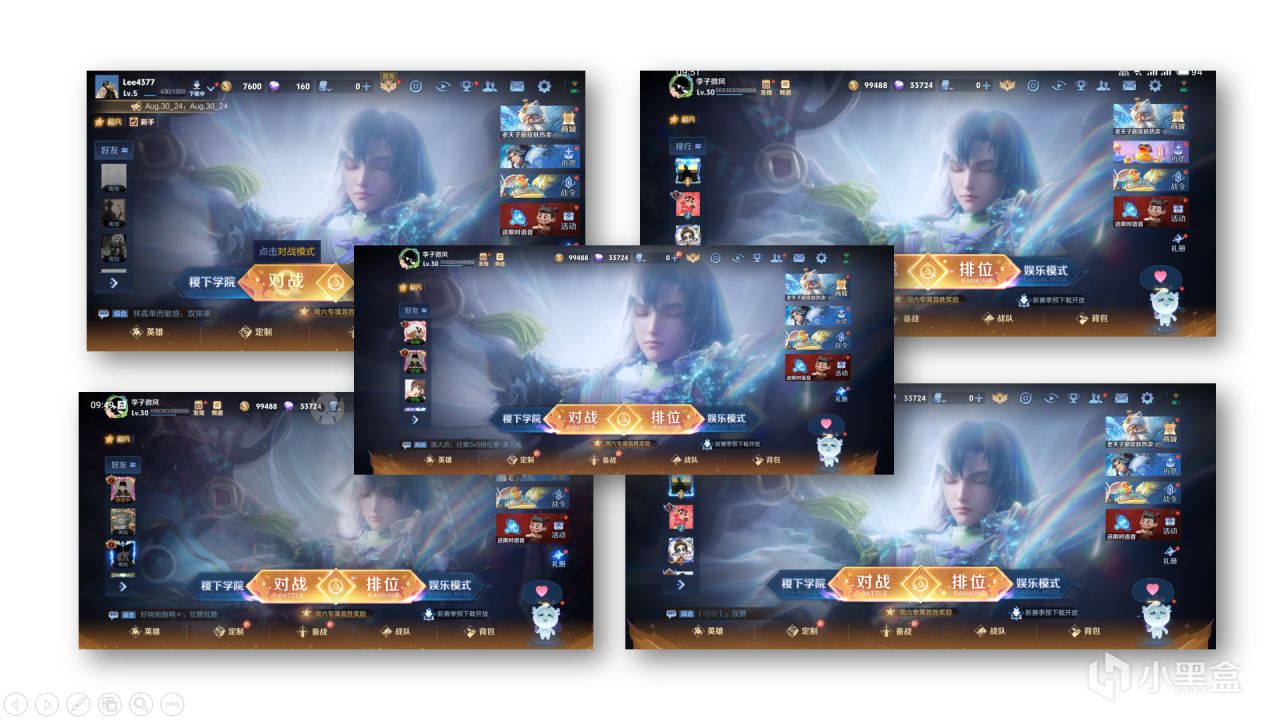 软件部分我们就测试到这, 开始测试游戏 。首先是王者荣耀 ,可以看到作为国民级游戏 ,王者荣耀的适配性还是非常好的, 五台手机都没有出现画面异常。