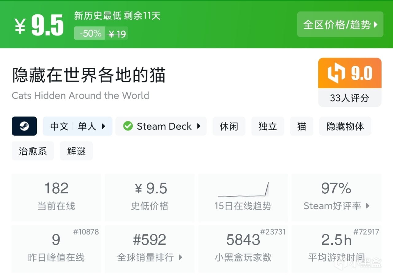 找貓貓遊戲,每找到一隻貓都會有“喵”的一聲並且解鎖一個成就,喜歡的人超級上頭,覺得很解壓,不喜歡的人會覺得無聊。系列有很多免費版,不是非要花錢買。