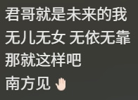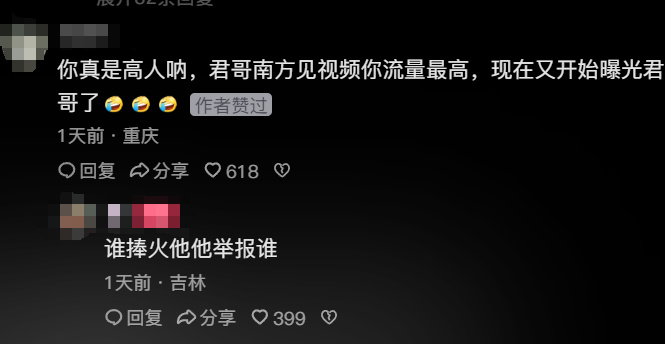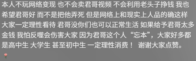 在评论区中,他一再表示:不希望有人因为“南方见”的爆火向君哥捐助太多金钱。因为君哥最常做的事情,就是在直播间中拉黑刷礼物的粉丝。用他本人的话所说,就是君哥这个人“忘本”。