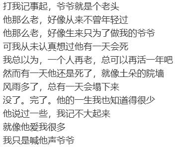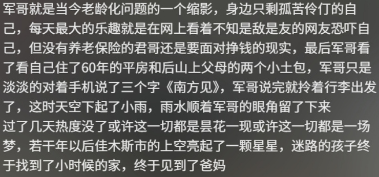 真正让这些“去南方”系列视频火爆全网的,则是对应的想象文学。在网友们的想象中,视频中的老头是一生从未走出县城的农民,去南方是他触不可及的梦,佝偻的老头不知道南方是哪,只知道必须去南方打工挣钱。于是,在这些想象文学的描述下——老头度过了一段模糊皲裂的人生,穿上干净整洁的马甲,带着不知前路的迷茫去往心目中的南方。