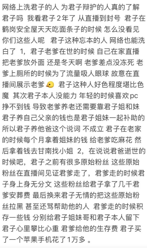 而这些只是沧海一粟。从这段网友的评论总结中,你可以很清晰地窥见,君哥在互联网上的传奇一生——在直播中透露自己的嫖娼经历,辱骂刷礼物的网友,消费已经去世的老爸……