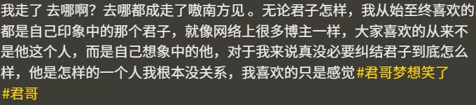 当虚构的“去南方”想象文学,与现实中粗粝的君哥碰撞后,相似的故事就注定会发生:无力验证事实的网友们将君哥捧上神坛,然后又被另一群揭露真相的网友所嘲笑谩骂,最终在情绪的斗争旋涡中,空留满目疮痍的互联网大粪坑。